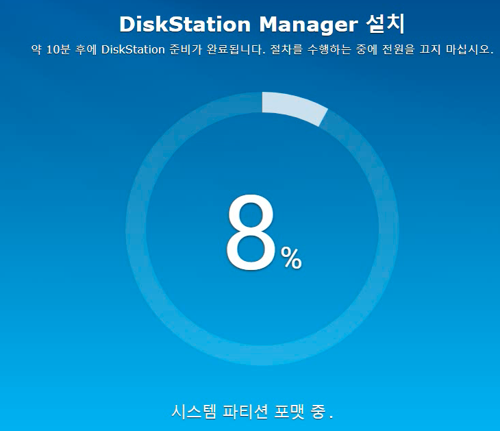 포맷을 하고 시놀로지 OS 설치가 시작됩니다. 100%까지 진행되면 자동으로 재기동합니다. 잠시 커피 한잔 하고 오세요.