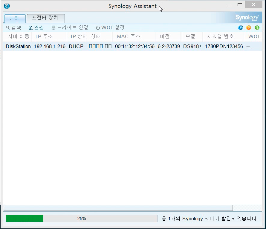 설치를 완료하고 실행하면 아래와 같이 내 네트워크안에 있는 시놀로지 제품을 검색하게 됩니다. 제 헤놀로지는 192.168.1.216이군요!