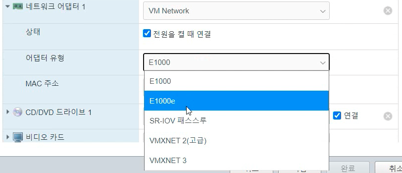 이제 랜카드를 설정하겠습니다. 네트워크 어댑터1에서 어댑터 유형을 'E1000'로 변경합니다. E1000e로 해도 무방합니다. 참고로 E1000은 1기가비트 랜카드이고 E1000e랜카드는 100메가비트 랜카드입니다. 랜케이블이 기가비트면 E1000로 하는게 좋겠죠?