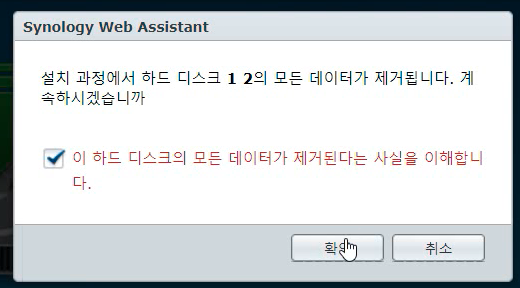 경고문이 하나 나옵니다. 모든 데이터를 삭제한다고 협박하지만 알았다고 체크하고 [확인] 버튼을 누릅니다.