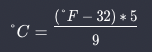 Q2. 화씨 온도(°F)를 섭씨 온도(°C)로 바꾸어주는 프로그램을 만들려고 합니다. 섭씨와 화씨의 관계식은 다음과 같습니다: