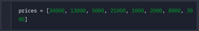 prices = [34000, 13000, 5000, 21000, 1000, 2000, 8000, 3000]