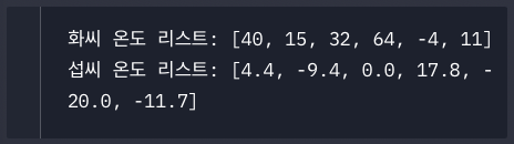 print("섭씨 온도 리스트: " + str(temperature_list)) # 섭씨 온도 출력
