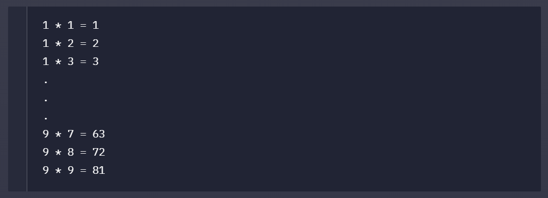 Q3. 구구단 프로그램을 while문이 아닌 for문을 사용해서 만들어 보세요. 코드를 실행하면, 아래와 같이 출력되어야 합니다.