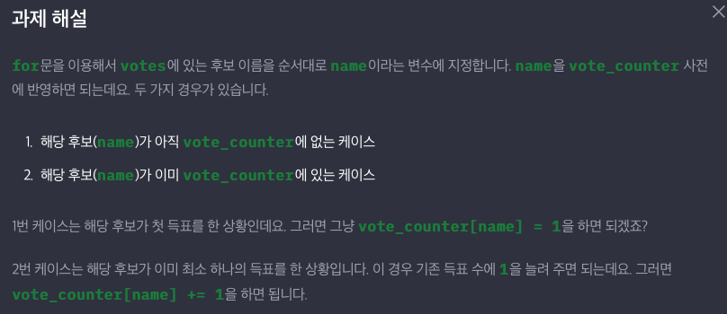 Q3. 효신이는 매년 국회의원 선거 때마다, 성북구에서 집계 도우미 봉사를 하는데요. 작년까지는 표를 손수 세다가, 올해부터는 IT 시대에 더 적합한 솔루션을 개발하려고 합니다. 파이썬 리스트 votes에는 성북구민들의 투표 결과가 저장되어 있습니다. 리스트 votes의 정보를 토대로, 사전 vote_counter에 후보별 득표수를 정리하는 것이 목표입니다. 예를 들어서 votes가 ['허유나', '서혜선', '허유나']라고 가정하면, vote_counter는 {'허유나': 2, '서혜선': 1}이 되어야 하는 거죠.