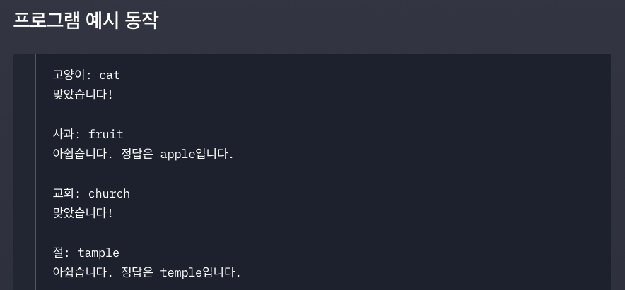 같은 단어를 여러번 물어봐도 괜찮고, 프로그램은 사용자가 알파벳 q를 입력할때까지 계속 실행됩니다.
