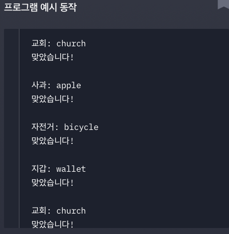 나머지 부분은 앞선 실습 과제랑 거의 똑같습니다. 유저에게 단어를 입력 받는다. 만약 유저가 q를 입력했으면 프로그램을 종료한다. 유저가 입력한 영어 단어가 정답인지 확인한다.