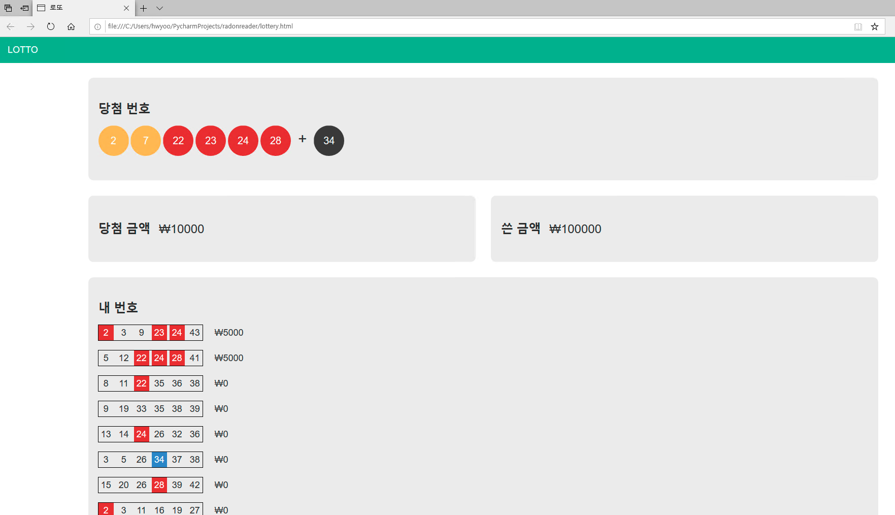 비주얼하게 웹페이지로 표시 : 아래 파일 다운로드하여 lottery.py 과 같은 폴더에 저장한 후, 실행시키면 아래와 같이 멋있게 나타난다.