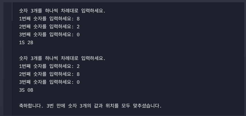 4. 사용자가 올바르게 숫자 3개를 입력하면, 규칙에 따라 "*S *B"가 출력됩니다.
