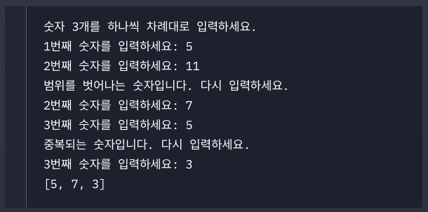 print("중복되는 숫자입니다. 다시 입력하세요.")