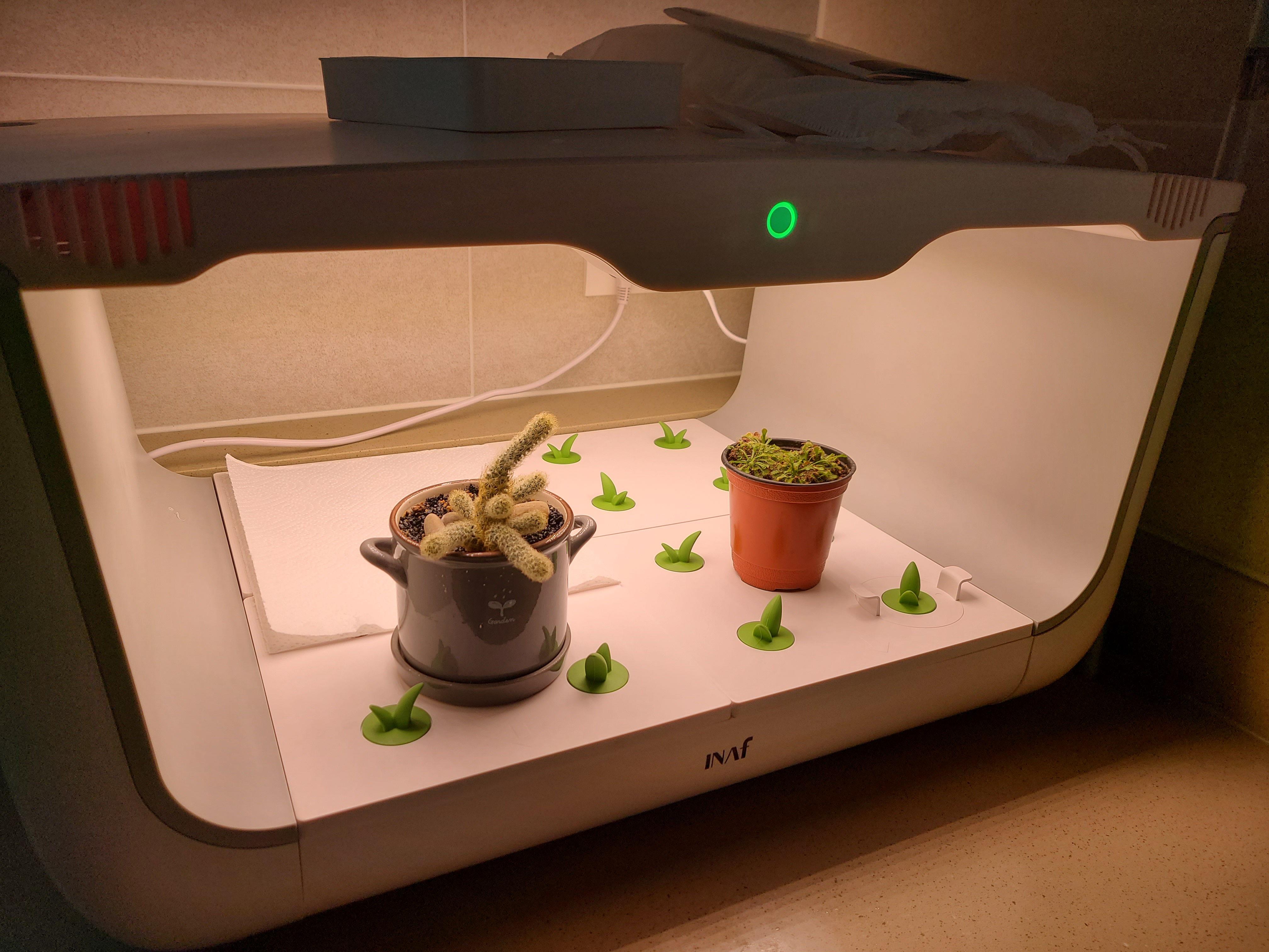 6. 발아가 됐다고 바로 스마트팜에 넣어주어선 안됩니다. 스마트팜 물에 뿌리가 닿아야 이 어린 새싹들이 지속적으로 자랄수 있습니다. 그렇기 때문에 약 1.5cm정도 뿌리가 자랄 때까지는 기다려주세요. 기다리는동안 발코니에 있던 파리지옥과 선인장을 가져왔습니다. 춥고 해를 잘 못봐서 그런지 별로 크지 않았네요. 발아하는동안에는 이나프 야채재배기에 놓아서 광합성 할 수 있게 해줄려고 데려왔습니다. ㅎㅎ
