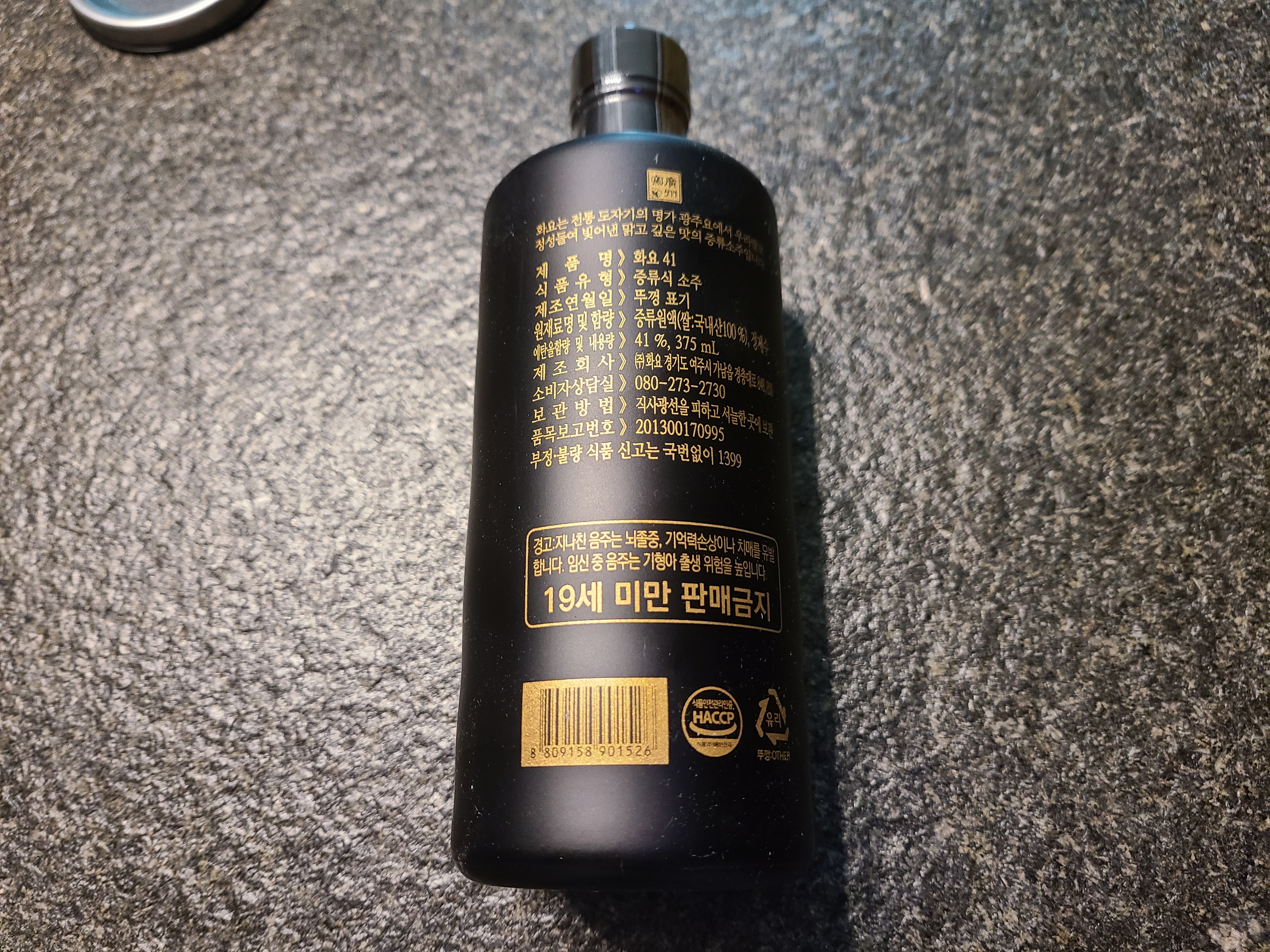 화요는 소주입니다. 증류식 제조되었기때문에 통풍 걱정이 없습니다. ㅎㅎ 용량이 375ml밖에 안된다는 점은 아쉽네요. 위스키는 750ml나 되는데 말이죠. 아무튼 내가 먹는 위스키보다 비싼 녀석이네요.