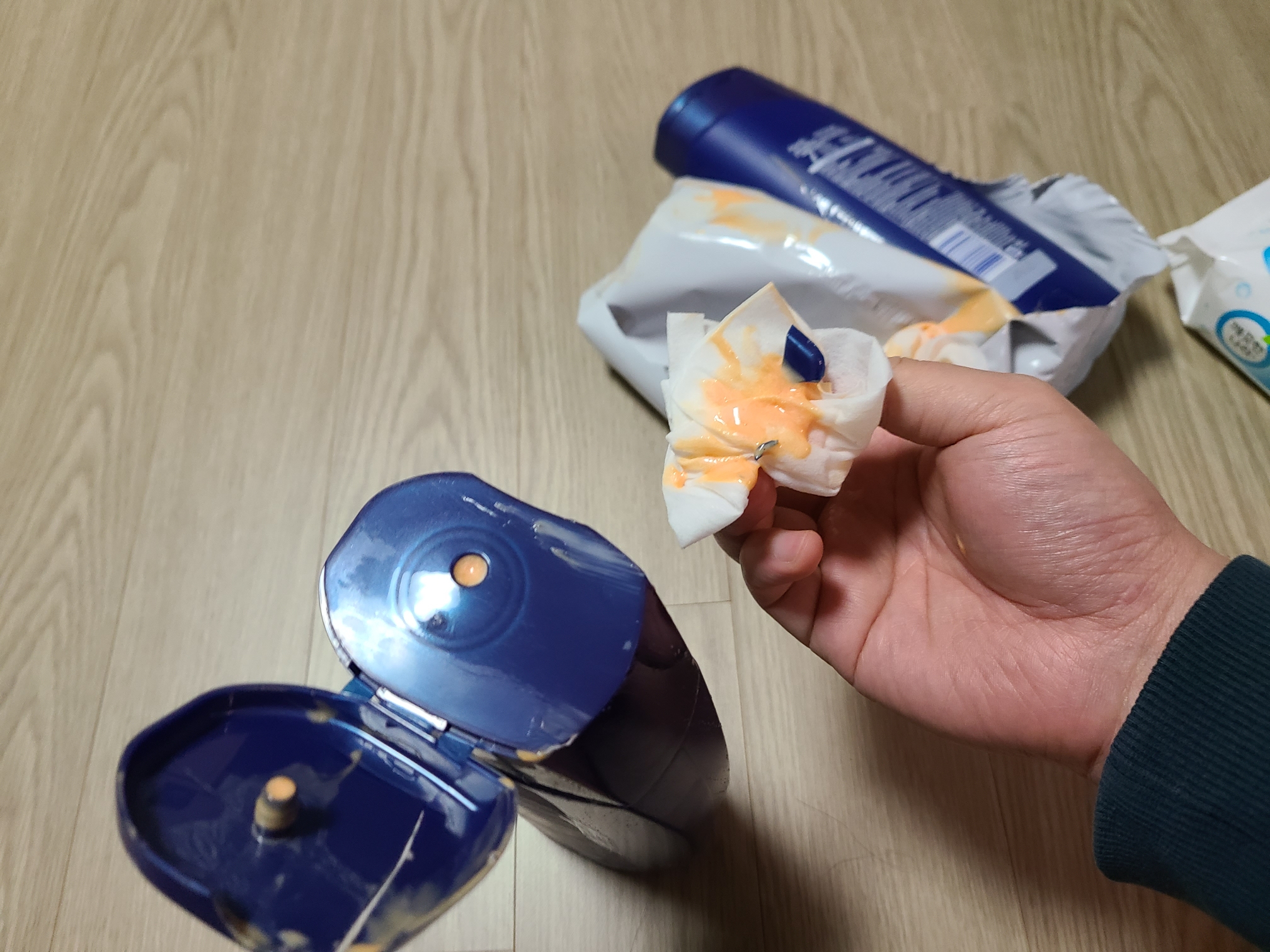 어쩔수 없이 물티슈로 닦고 정리를 했지만 마음은 좋지 않았습니다.ㅠㅠ 그나마 다행인것은 옆구리가 깨진게 아니라 윗뚜껑이 깨져서 최악의 상황은 면했다고 생각했습니다.