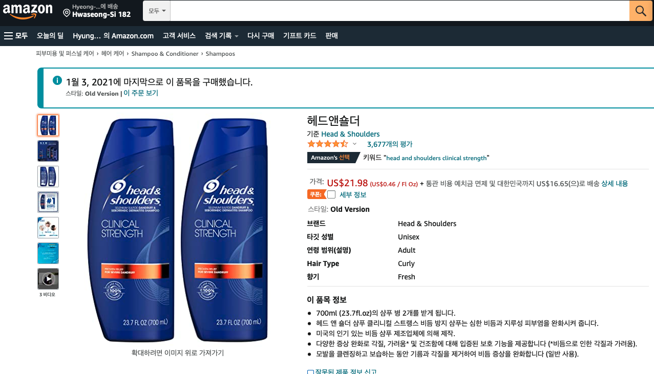 인터넷을 검색하다가 지루성 두피에 매우 효과적인 샴푸가 있다길래 한번 주문을 해보았습니다. 이 제품은 한국에서는 판매되고 있지 않은 상품인데요. 그 상품은 바로 '헤드앤숄더 클리니컬 스트렝스'입니다.