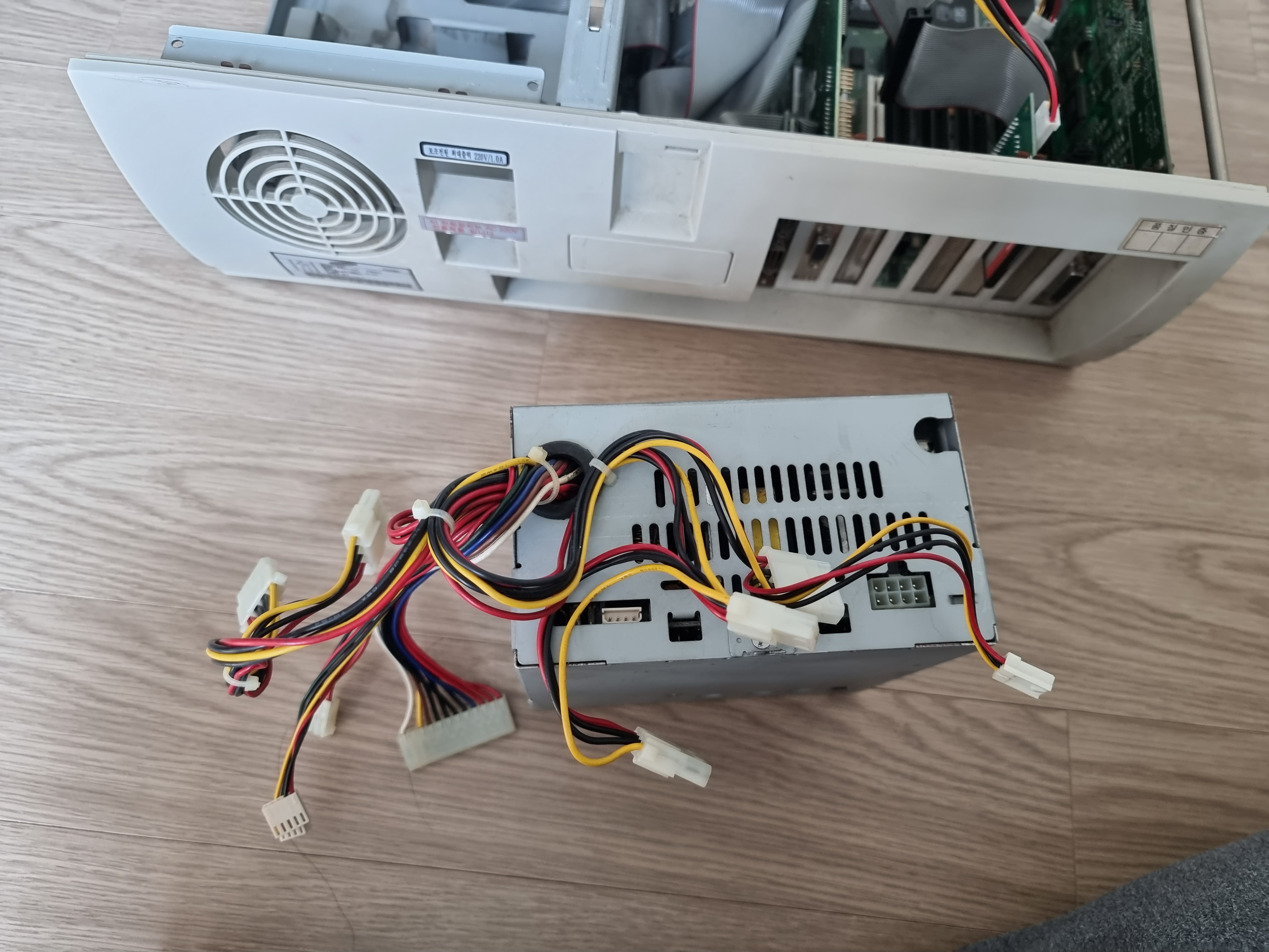 2. 떼어낸 파워의 뚜껑을 열어줍니다. 와 먼지가 장난 아니네요. 20년도 넘은 컴퓨터다 보니 이 먼지는 최소 20년 넘은 먼지군요. 최대한 분해를 합니다. 여기서도 사진을 많아 찍어두세요. 나중에 재조립시 필요합니다.