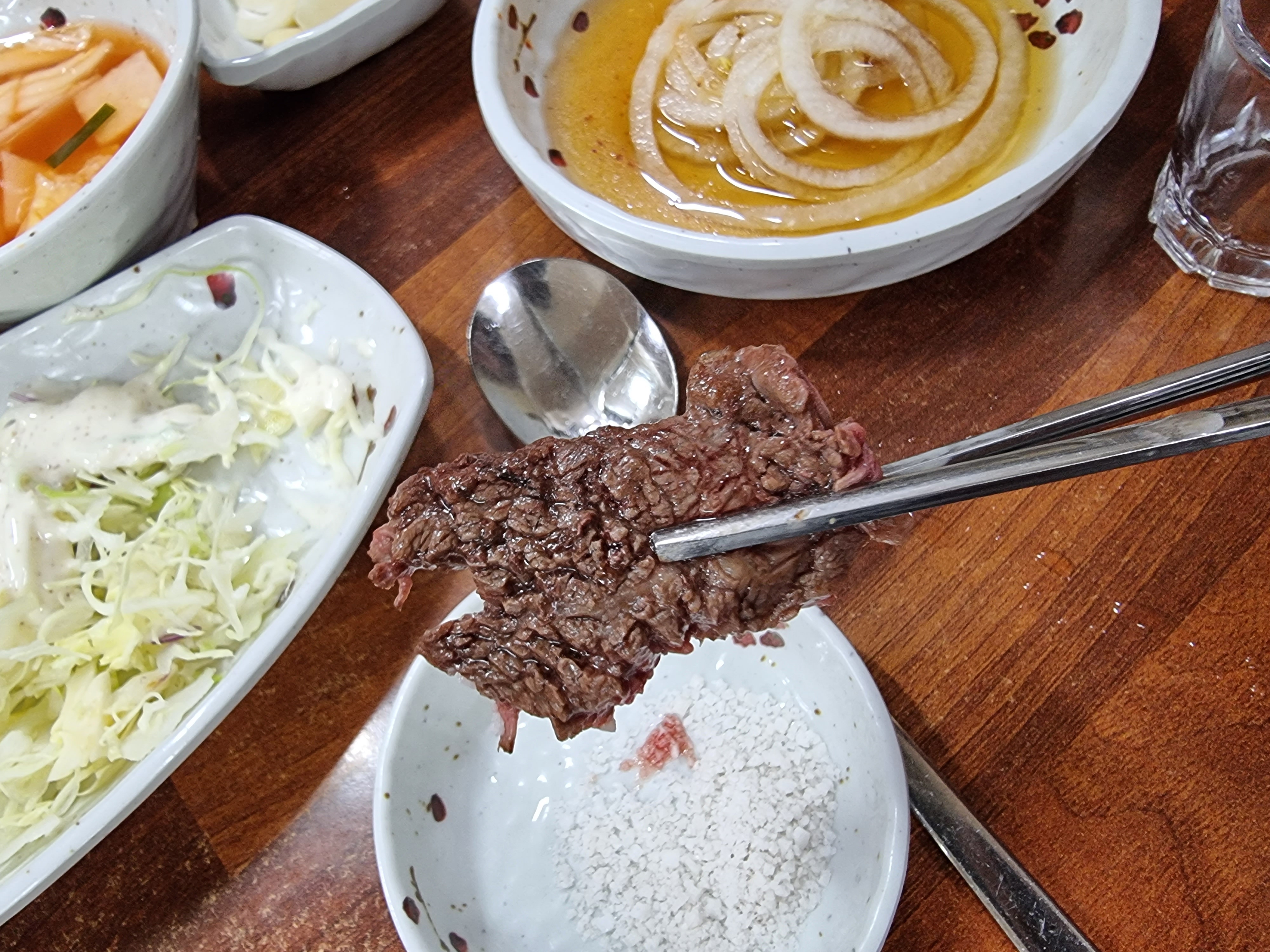 5. 고기는 가위로 자르면 주인장에게 한소리 듣습니다. 숟가락으로 쩌억쩌억 찢으면서 먹어야 정석이라고 하네요.ㅎㅎ