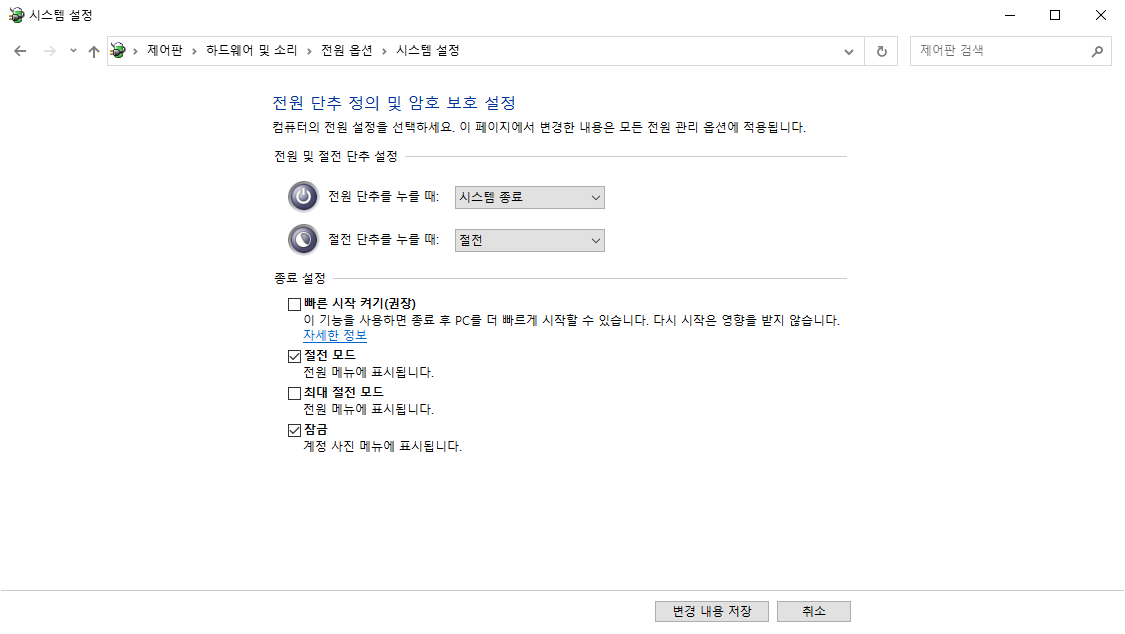 추가) 인터넷에 찾아보니 '빠른 시작 켜기'때문에 재시작이 원할하게 안될 수 있다고 합니다. 윈도우 기본값은 ON인데 이녀석이 원인인거 같아서 OFF해두었습니다.
