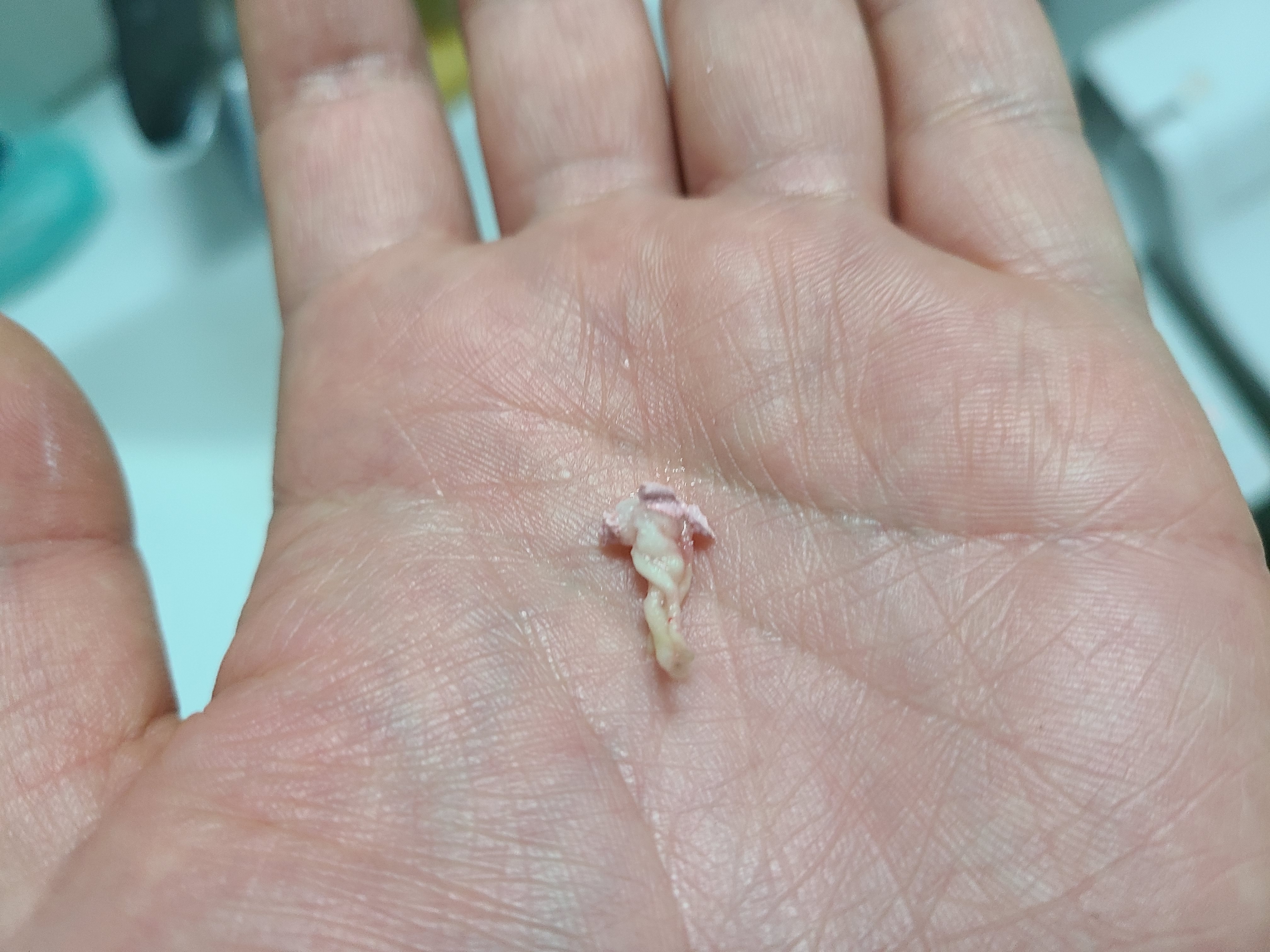 의사샘도 응급처치로 떼어내면 괜찮을거라고 하셨거든요. 아픈이유는 간단합니다. 치아안에 염증이 나오는데 이게 가득차면서 신경을 건들이고 압력이 점점 차면 더더더욱 아프게 되는것입니다. 어쨌든 저 도구를 이용하여 조금씩 긁어내고 하니까 안에 있던 천과 임시로 떼운게 나왔습니다. 염즘이 뿌리 깊은곳에 위치하다 보니 크기가 엄청나네요. 누런색으로 되어 있는 부분이 염증입니다.