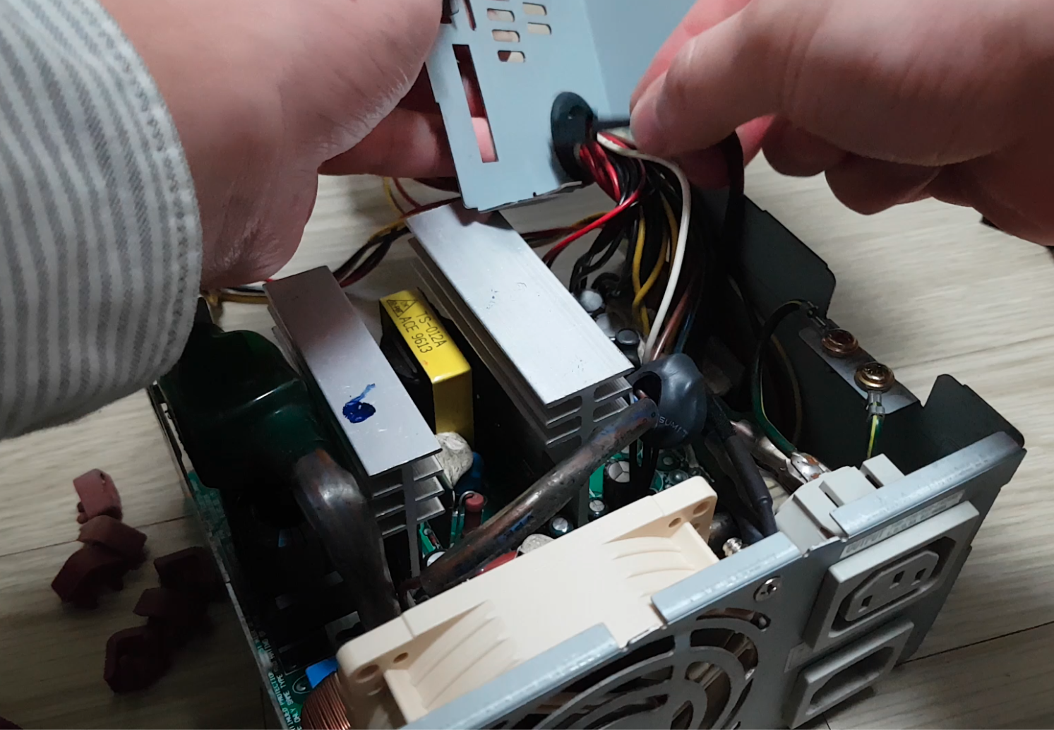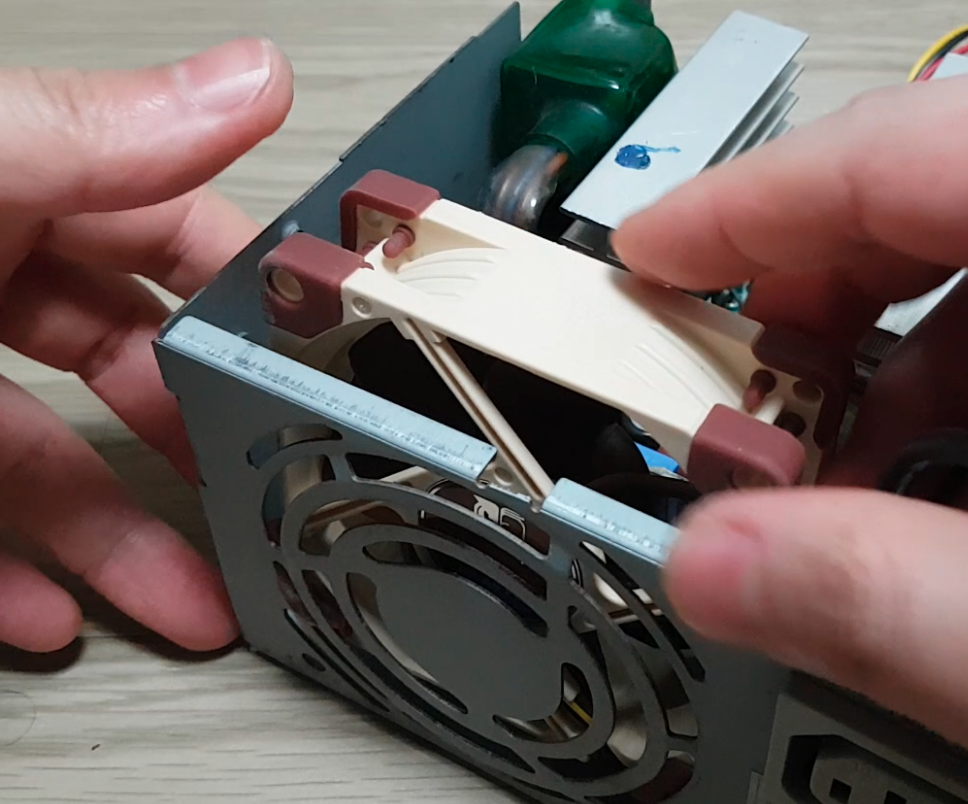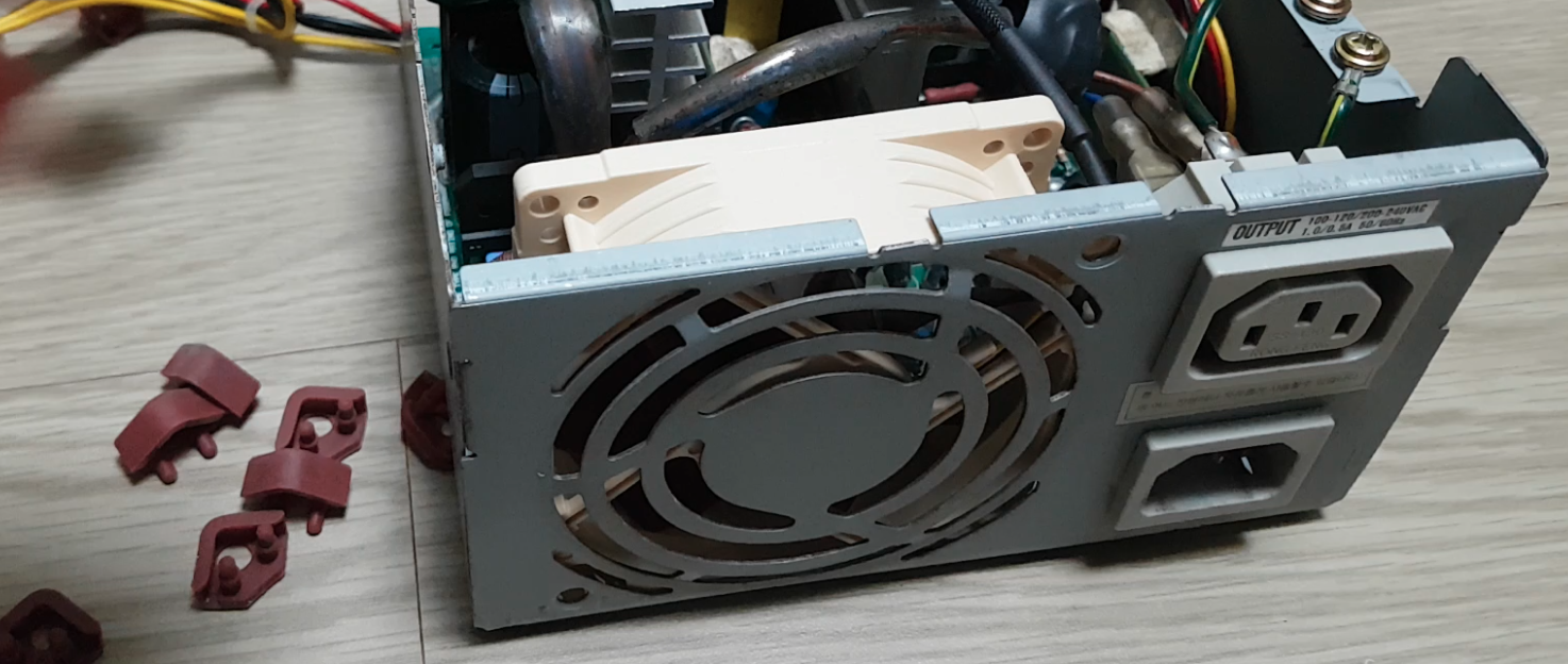 이제 PSU를 분해합니다. 나사를 풀고 PSU내부를 보면 팬이 제거되어 있는것을 확인할 수 있습니다. 여기에 이 똥투아를 장착해주면 됩니다.