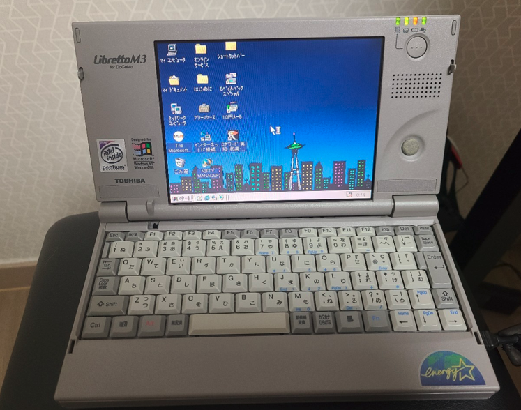 어댑터를 연결 한 후 전원을 켜보았습니다. RTC가 방전되어 있네요. 기본값으로 설정한 다음 부팅을 시도했습니다. 그랬더니 윈도우98화면이 나오면서 초기 설정화면으로 이동하였습니다. 이름, 소속 같은거 적고 다음 다음 다음 다음 을 눌렀습니다. 그랬더니 윈도우98 바탕화면이 표시되었습니다. 일본 내수 제품이라서 일본어 윈도우98...다행히 일본어 히라가나, 카타카나는 읽을 수 있어서 기본적인 사용은 가능한 상태였습니다.