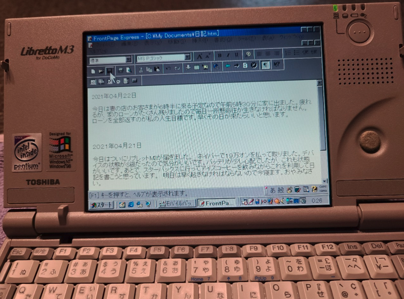 제품상태 및 배터리 상태 모두 매우 양호....이제 이걸 가지고 뭘 할지 고민해야합니다. 옛날 노트북으로 할껀....일기쓰는거 밖에 없습니다. ㅡ.ㅡ 만만한게 일기지요. 하지만 리브레또는 일본어판 윈도우98이 설치되어 있습니다. 고로 한국어는 사용 할 수 없는 구조인것이지요. 밀까? 하다가 있는 그대로 사용하는게 좋을 것 같고, 일본어 공부해야됐는데 뭐 잘 됐다 싶었습니다. 일본어로 하루에 짧게라도 일기를 써보자!! 매우 발전적인 생각 아닙니까?ㅋㅋㅋ 나중에 블로그에 한꺼번에 올릴꺼니까 Front Page Express라는 홈페이지 제작 도구를 이용하여 일기를 쓸 예정입니다.