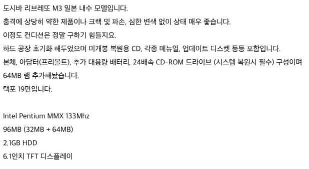알림을 설정하고 몇주가 지났습니다. 일하고 있는데 갑자기 알림이 뜨더군요. 게다가 딱 '리브레또'라고 명시한 글이였습니다. 바로 이거다 싶어서 네이버 카페 앱을 켜서 들어가 보았습니다. 아래와 같이 판매글을 등록해두었는데 상태가 매우 좋아보였습니다. 그리고 램 64메가를 추가했다는 점, 변압기 없어도 되는점이 장점으로 보였습니다.