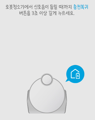 4. 청소기에서 신호음이 들릴때까지 충전복귀 버튼을 3초 이상 길게 누릅니다.