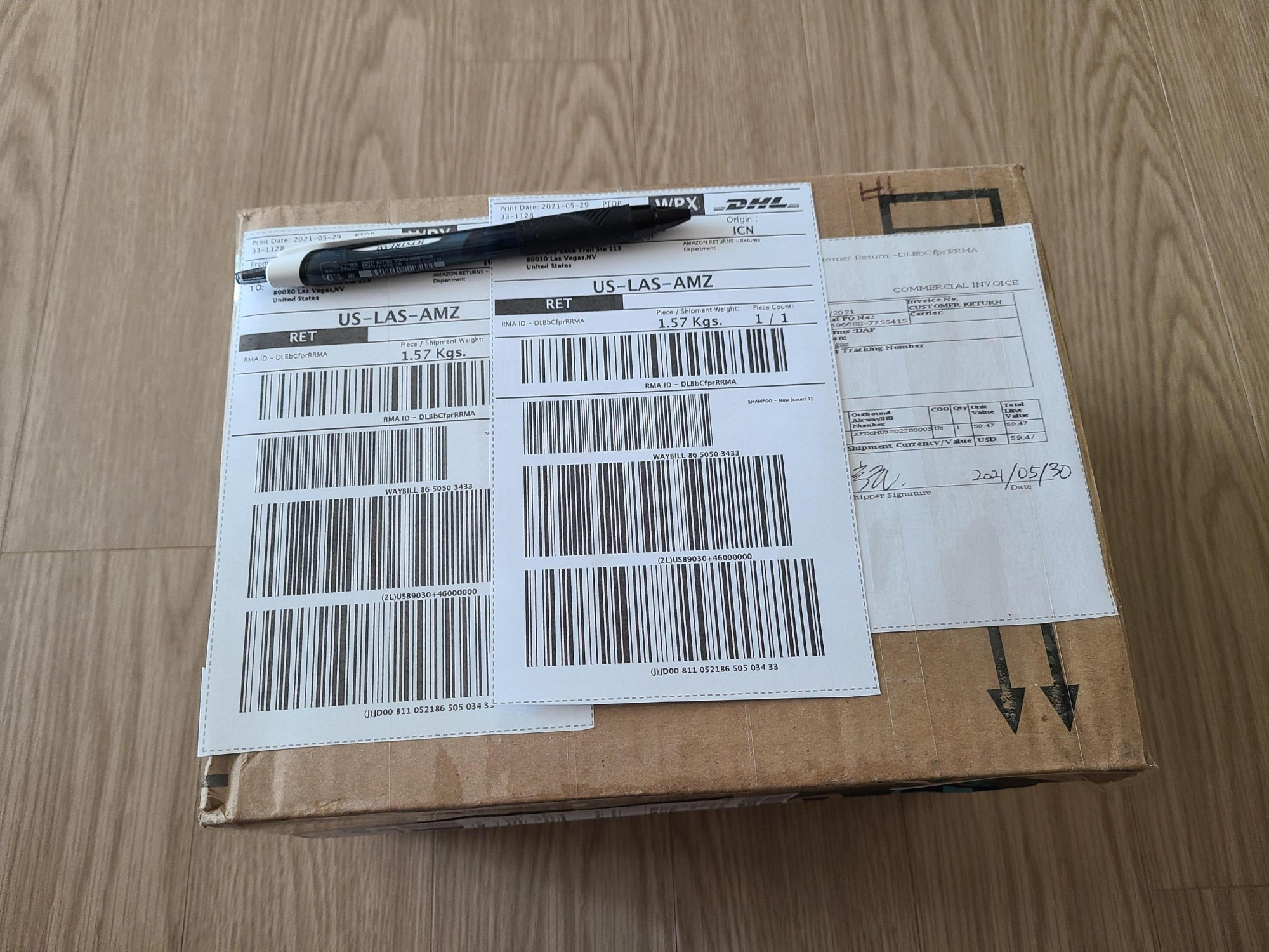 맨 아래 바코드만 있는것은 상자안에 넣고 라벨 2개가 있는데 하나는 상자에 붙이고 나머지 하나는 DHL 직원이 가져갈 수 있도록 살짝 붙여놓습니다. 그리고 인보이스도 하나 상자에 붙여줍니다. 인보이스 하나 남은것은 내가 가지고 있습니다.