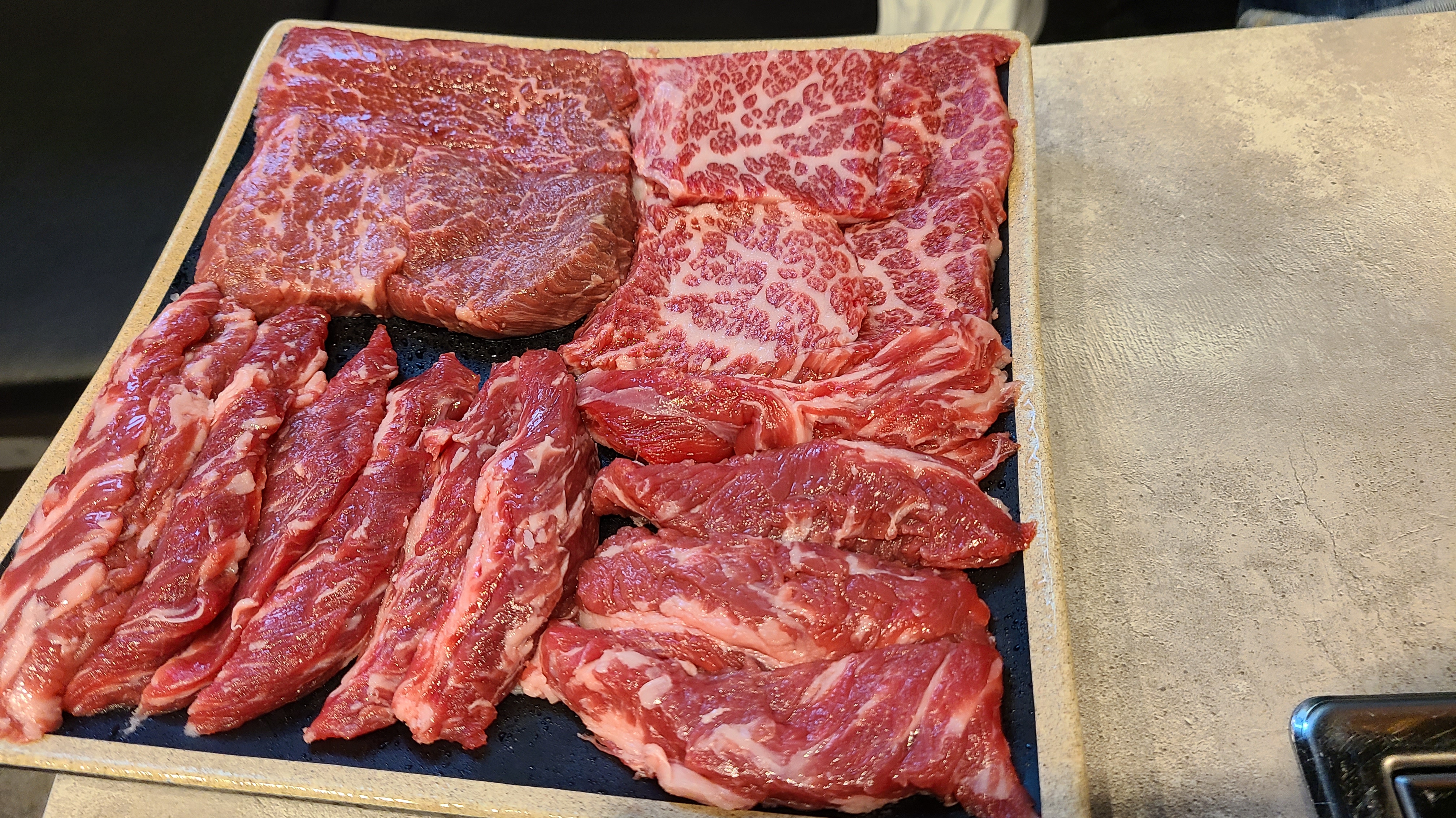 4. 부드럽소 한판과 반찬이 나왔습니다. 눈꽃살로 추정되는 부위에 마블링이 예술이였습니다 ㅎㅎ 이런 마블링이라면 먹어보지 않고도 맛있을거라고 짐작이 됩니다.