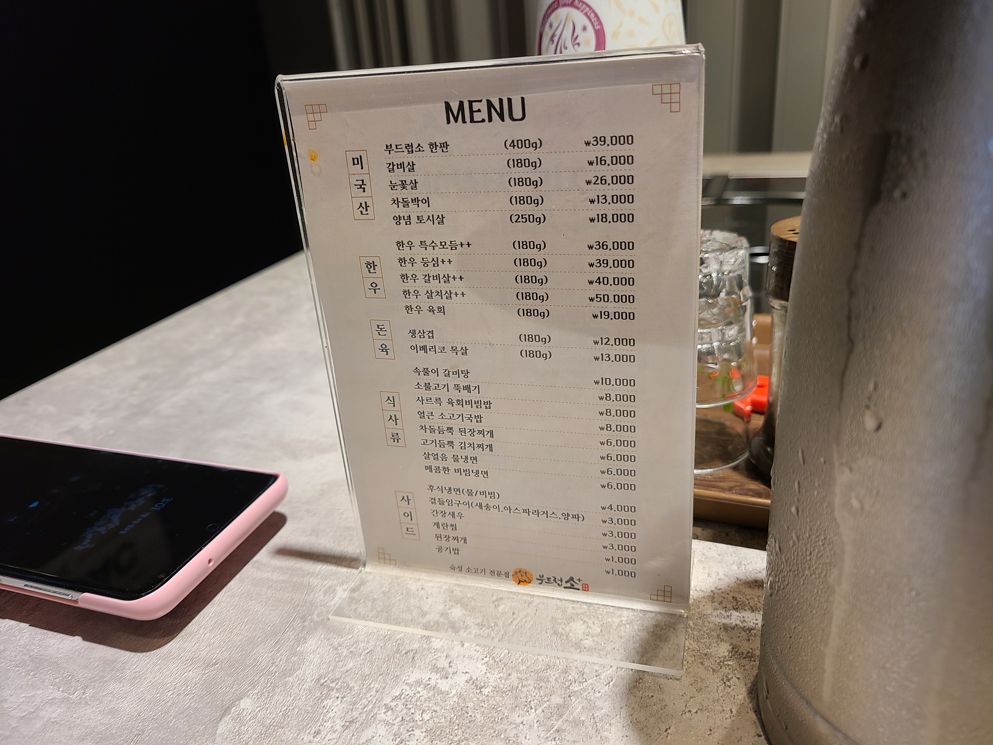 3. 가격표를 보았습니다. 한우는 180그램인데 3~5만원으로 형성되어 있어서 저같은 서민이 먹을 가격이 아니였습니다. 미국산 부드럽소 한판을 시켰습니다.
