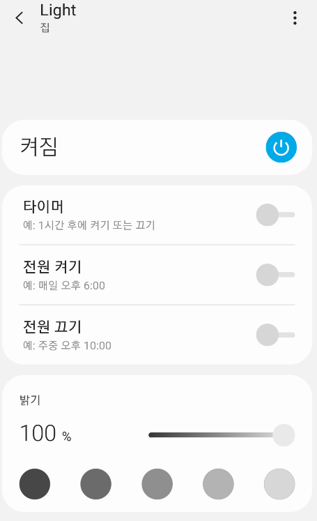 에디슨전구는 2700K로 고정이여서 바로 색온도를 바꿔주는 옵션이 보이지 않고 밝기를 1~100%까지 조절할 수 있습니다. 다만, 밝기를 바꿨는데 바로 적용은 되지 않고 꼭 첫번째 명령은 씹히더라고요. 두번 명령을 줘야하는 불편이 있습니다.