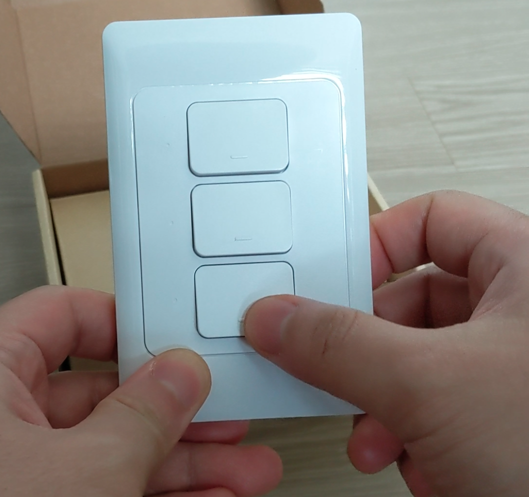 터치식이 아닌 물리버튼 채용으로 기존 비IOT스위치와 이질감이 없는 디자인입니다. 딸깍, 딸깍 하는게 제법 누르는 맛이 납니다. 버튼 좌측으로 보면 조그마한 구멍이 있는데 이게 현재 버튼 상태를 나타내는 '인디케이터 라이트'입니다. 스위치 OFF된 상태에서는 파란색, 스위치를 ON한 상태에서는 주황색으로 표시됩니다. 조그마한 구멍이여서 딱 눈에는 띄지 않지만 귀엽네요. 스위치 본체는 무광이고 커버는 유광으로 처리되어 있습니다.