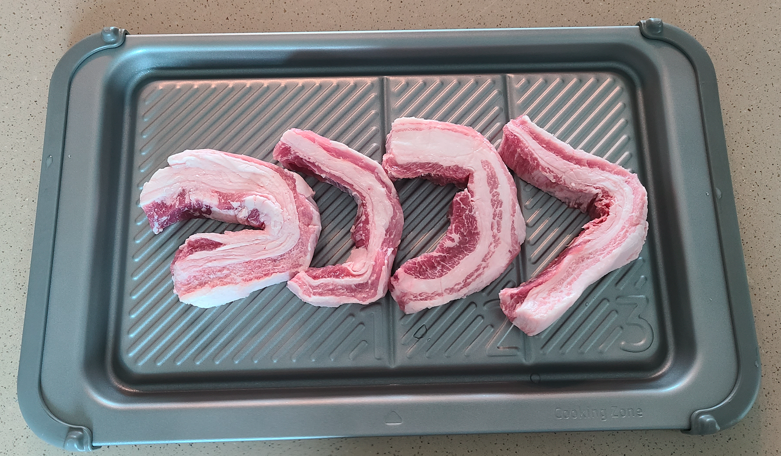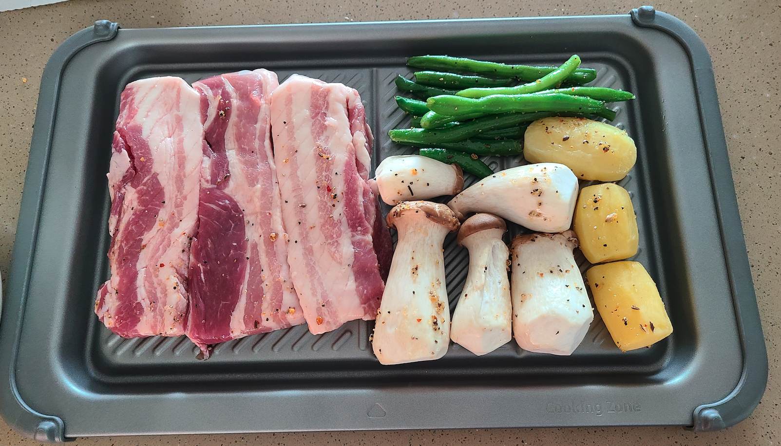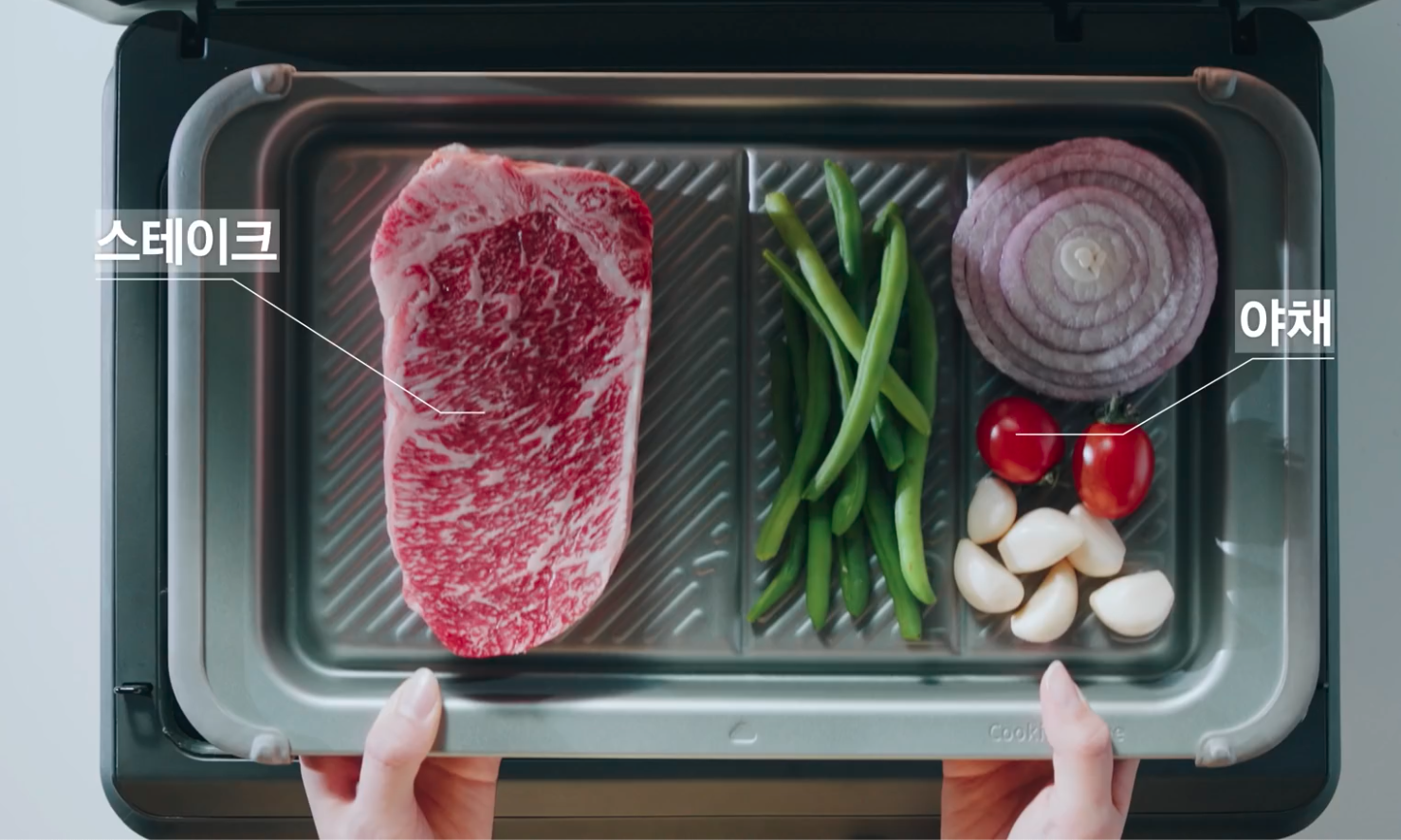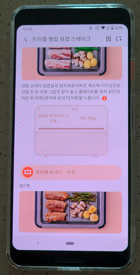 삽결살이 먹고 싶어서 삼겹살 상품의 바코드를 찍었는더니 재료를 씻고 시즈닝을 한 후 번호에 맞게 '그릴플레이트'에 배치한 후 [큐커에 보내기]를 눌러서 조리를 해라 라고 아주 친절하게 알려주세요.