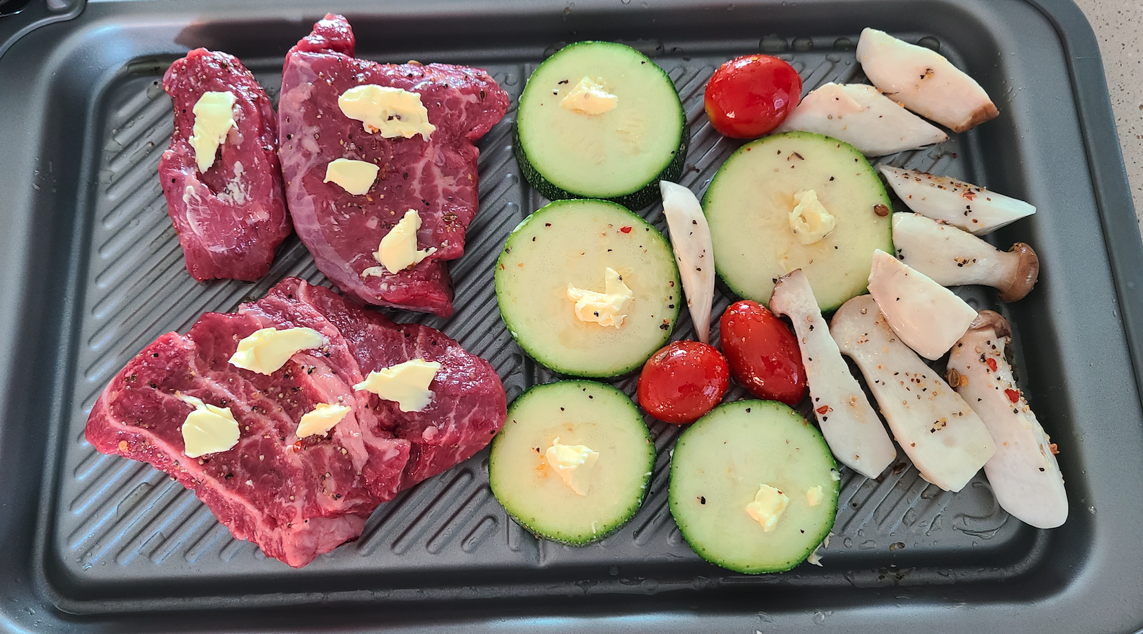 그릴 플레이트를 상단에 끼우고 조리를 시작했습니다. 조리시간이 약 18분 정도입니다. 한 반정도 돌아갔을 때 뒤집으라고 알려주네요.ㅋㅋ 꺼내서 뒤집고 다시 조리 시작!