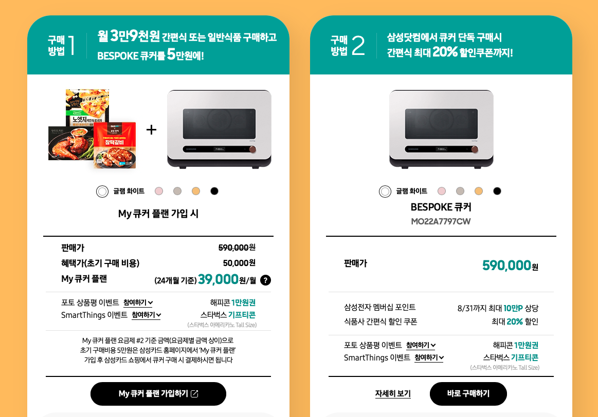 그런데 이번에 삼성에서 비스포크 큐커라는 밀키트에 특화된 제품이 나왔다는 정보를 입수와 함께 좋은 프로모션이 있어서 구매하였습니다. 프로모션 내용은 초기 5만원 구입하고 2년간 다달이 약4만원정도 밀키트 구매가 필요한 조건이였습니다. 어차피 밀키트를 구입하고 있었고 내 뱃속으로 들어가는거니 거의 공짜라고 생각하여 지르게 되었습니다.