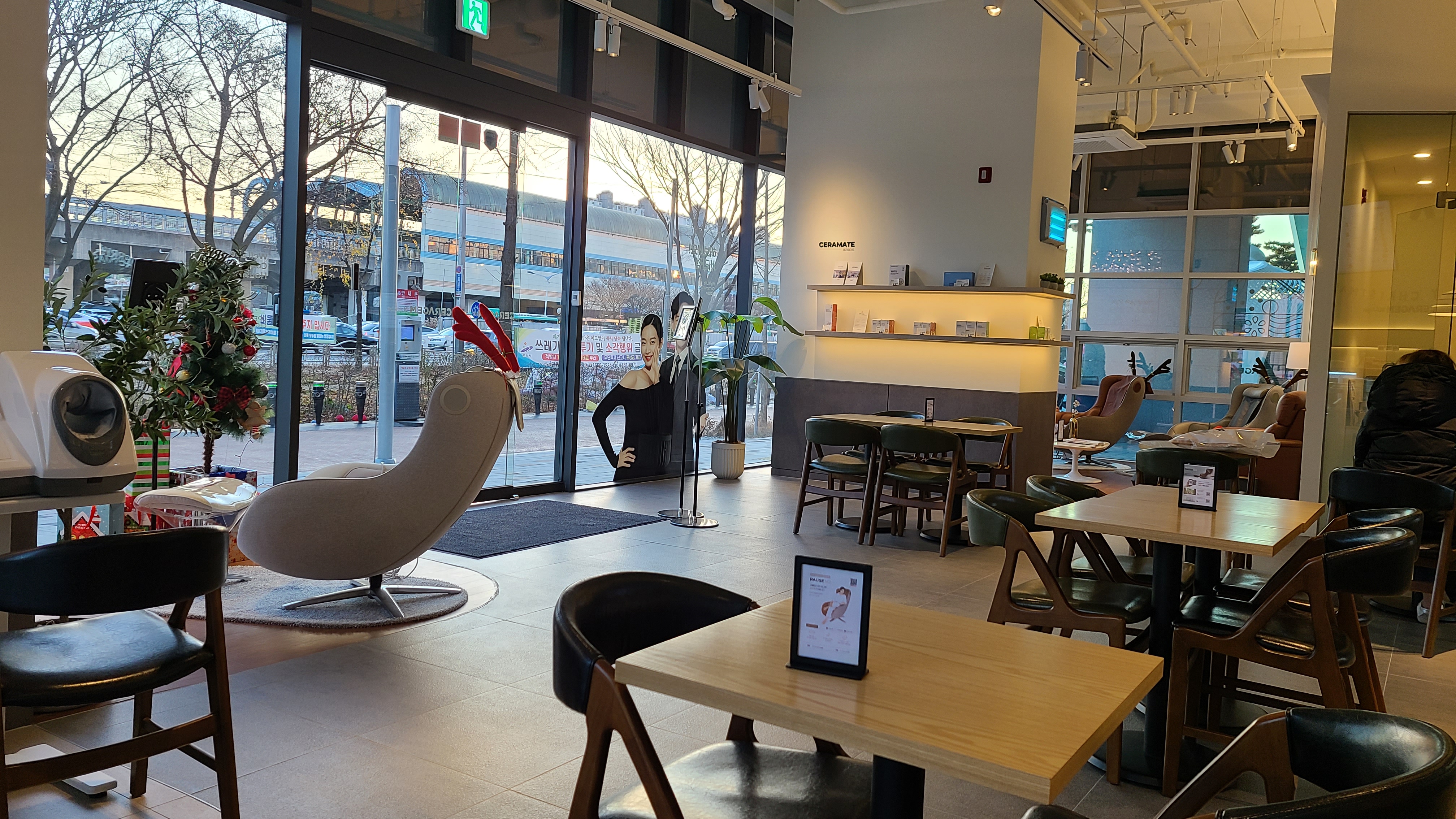 정식명칭은 세라젬웰카페 입니다. 안에 들어가보니 진짜 카페같이 해 놓았더라고요. 카페답게 음료수 하나는 주문해야 체험할 수 있는 이용권을 줍니다. 처음 방문이면 음료 주문 없이 체험할 수 있습니다.