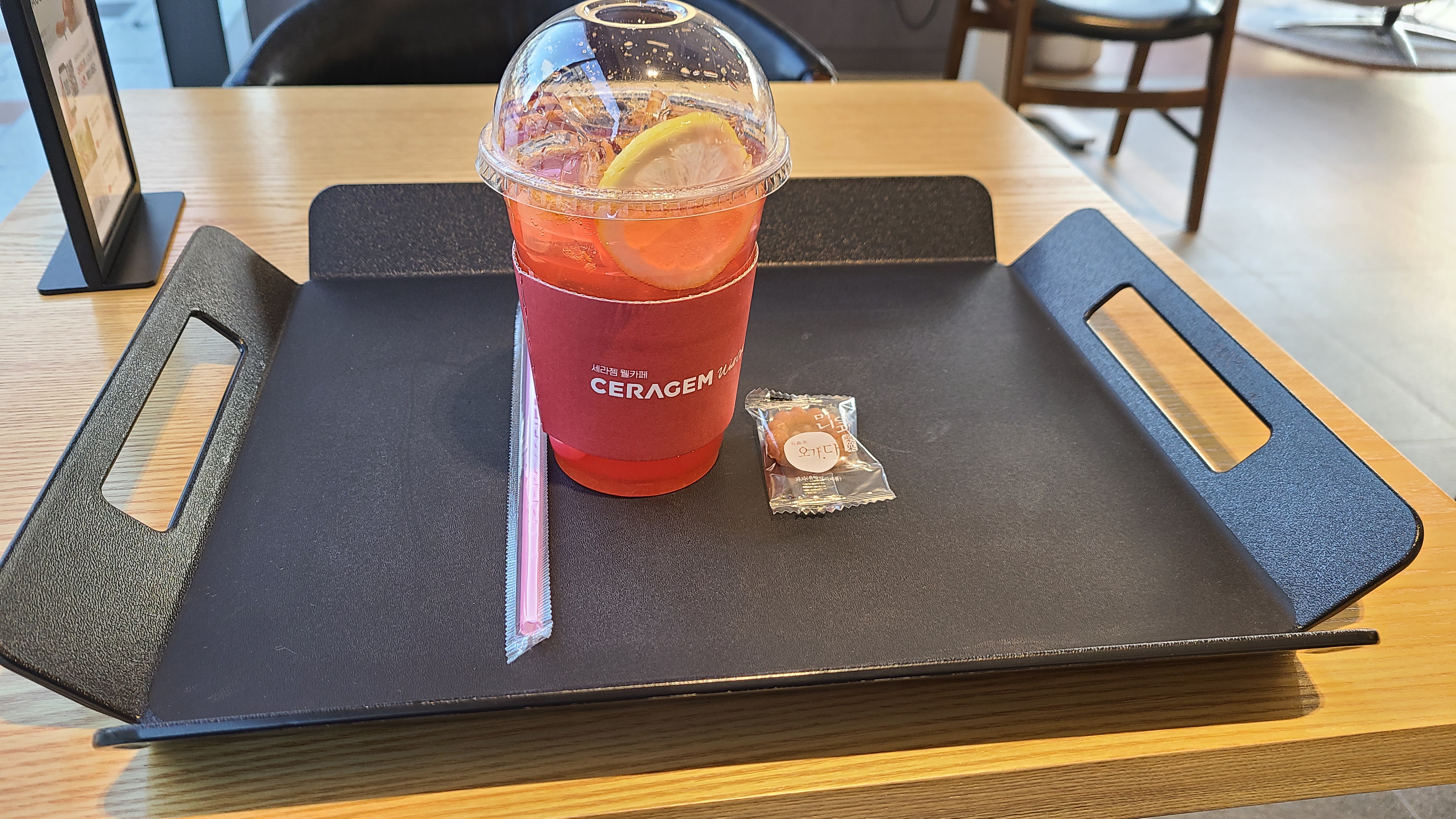 다시 카페에 앉아 있으면 주문한 음료와 미니약과를 줍니다.