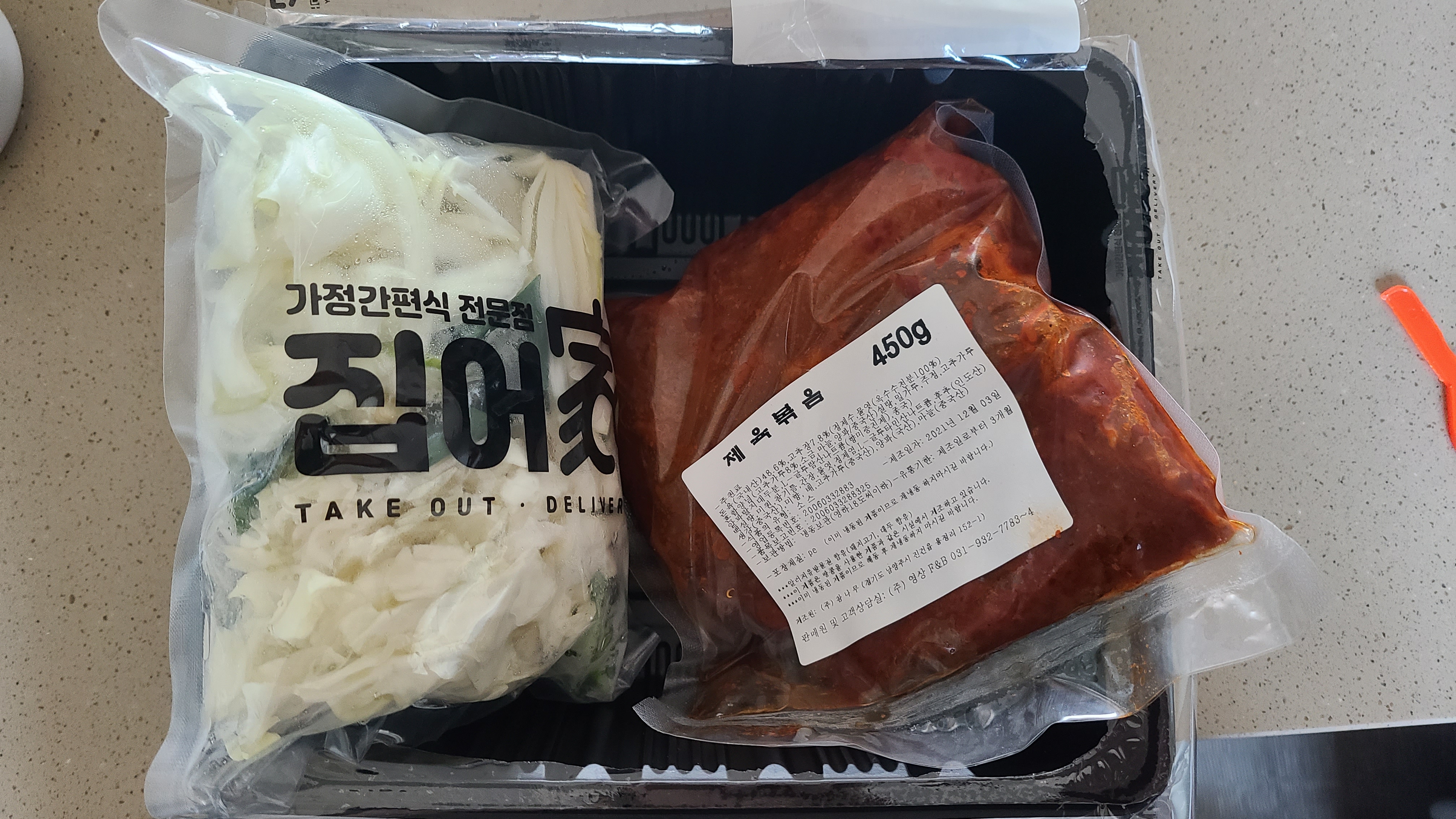 포장지를 뜯으면 야채, 제육볶음 2개 모듈로 이루어져 있습니다.