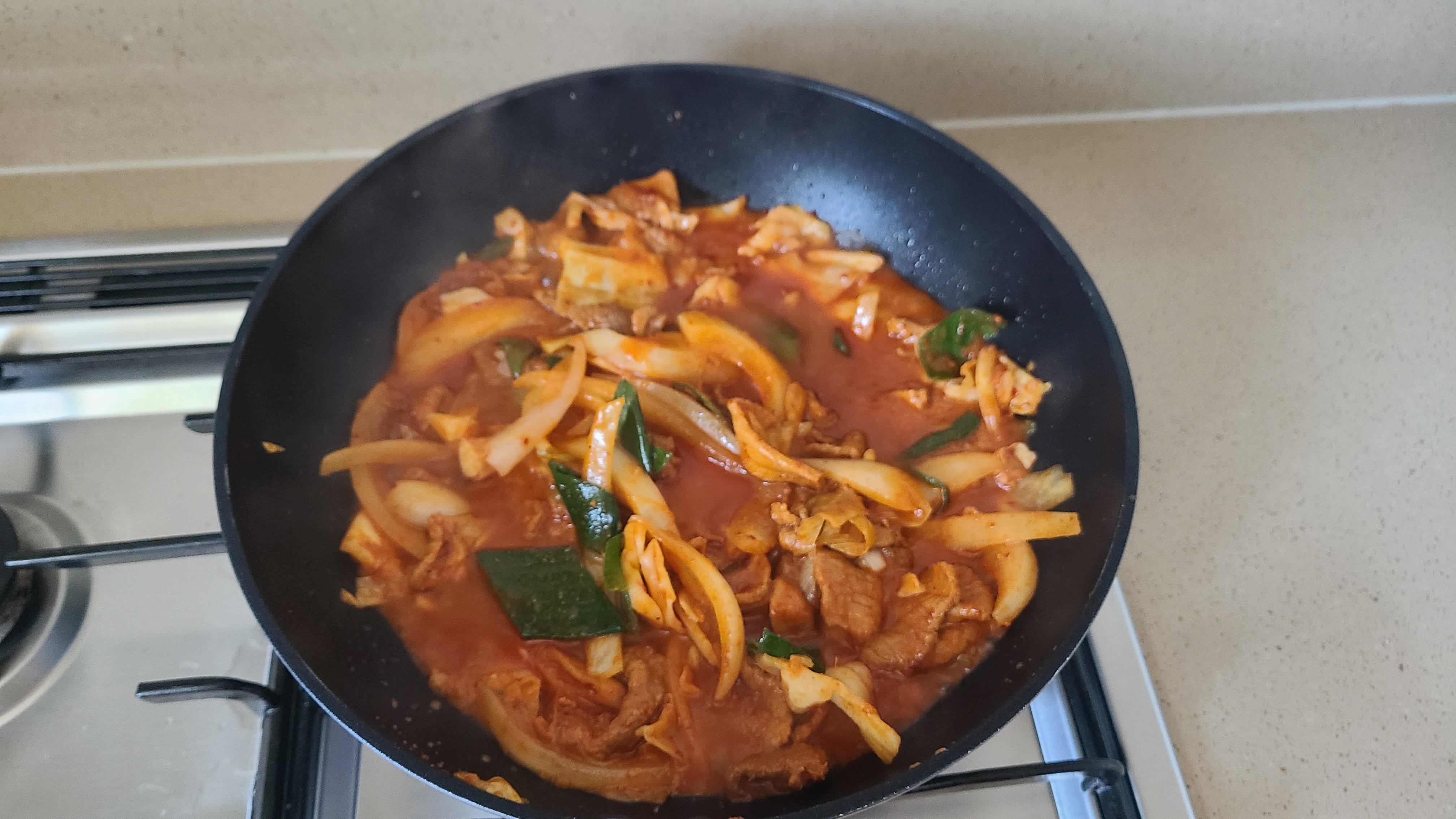 어느정도 고기가 익었다 싶으면 그때 아채도 넣어줍니다. 안에 청량고추가 있는데 정말 매운걸 좋아하는 사람이 아니라면 넣지 않는것을 추천합니다. (청량고추 안 넣어도 매콤한 수준입니다.) 그리고 잘 저어줍니다.