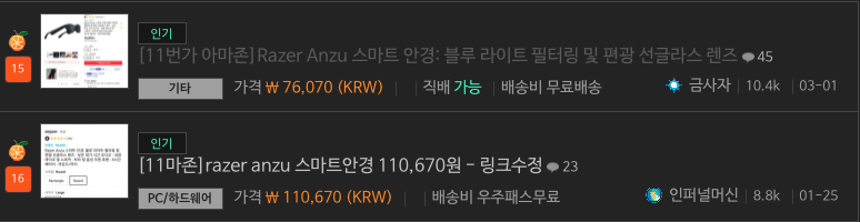 Razer Anzu 스마트 안경(이하 스마트안경)을 샀다. 역시나 퀘이사존에 특가로 떠서 말이다. 1월달에 11만원이였는데 3월달에 7.6만원으로 급격하게 가격하락이 있었다. 물론 난 1월달에 구입했다. 이때는 이 가격 밑으로 내려 가지 않는다는 굳은 신념이 있었는데 불과 2달만에 폭락한것이다. ㅠㅠ 처음엔 분노가 났었는데 그래도 한달간 오버워치 할때 잘 사용했기때문에 금방 안정을 되찾았다.