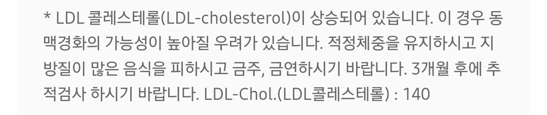 2. 콜레스테롤은 3가지로 구분한다. LDL, 중성지방은 나쁜 콜레스테롤 이라고 하고 HDL은 좋은 콜레스테롤이라고 한다. 하지만 LDL이 무조건 나쁜놈이라고도 할 수 없다. LDL에서도 사이즈가 큰 LDL은 면역력 향상 등 좋은 역할을 수행한다. 우리가 일반적으로 나쁜놈이라고 칭하는것은 사이즈가 작은 LDL이다. 하지만 건강검진에는 이것을 구분해주진 않는다.(비용이 비싸지는듯)