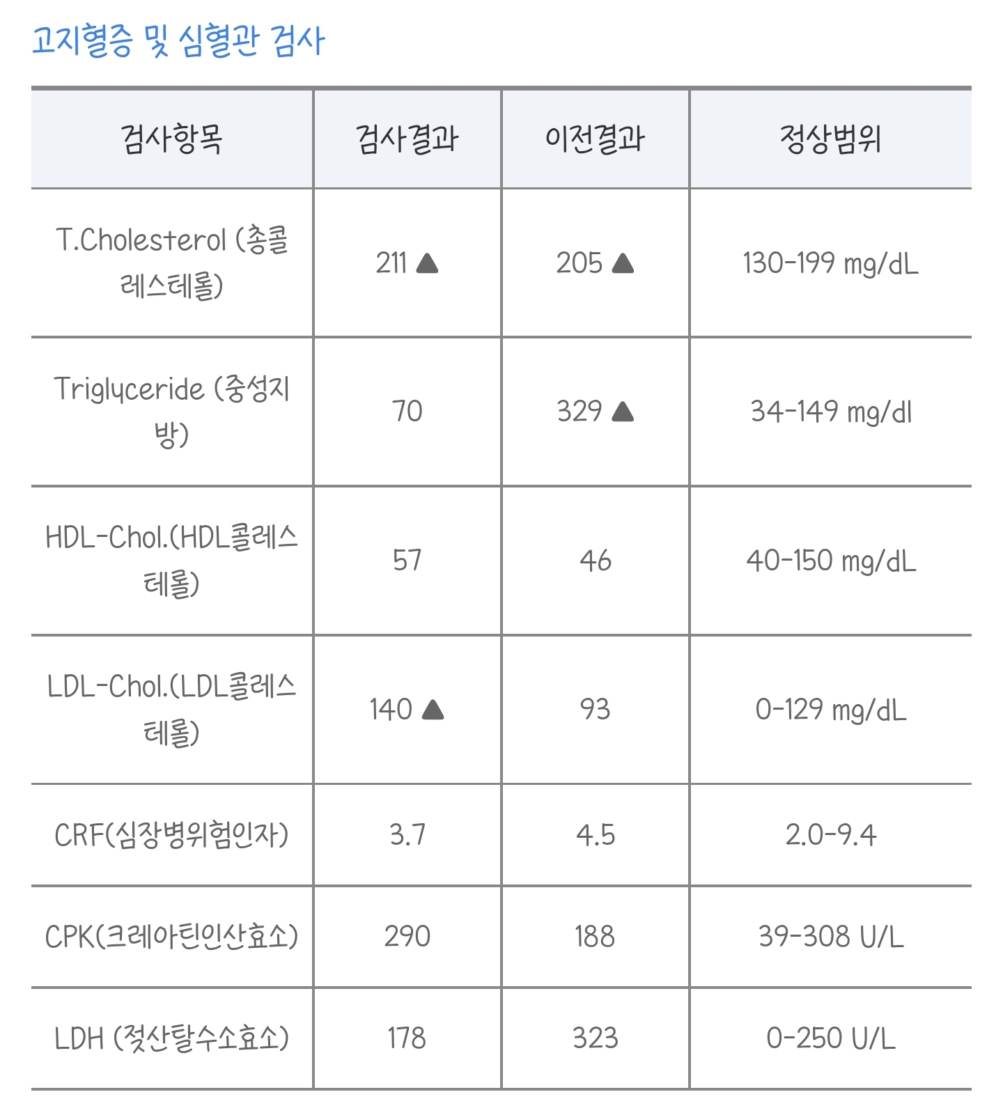 위의 내용은 콜레스테롤 가이드에 나와 있는 내용이다. 최근에는 오히려 LDL수치보다 중성지방 수치에 더 관심을 보이고 있다.
