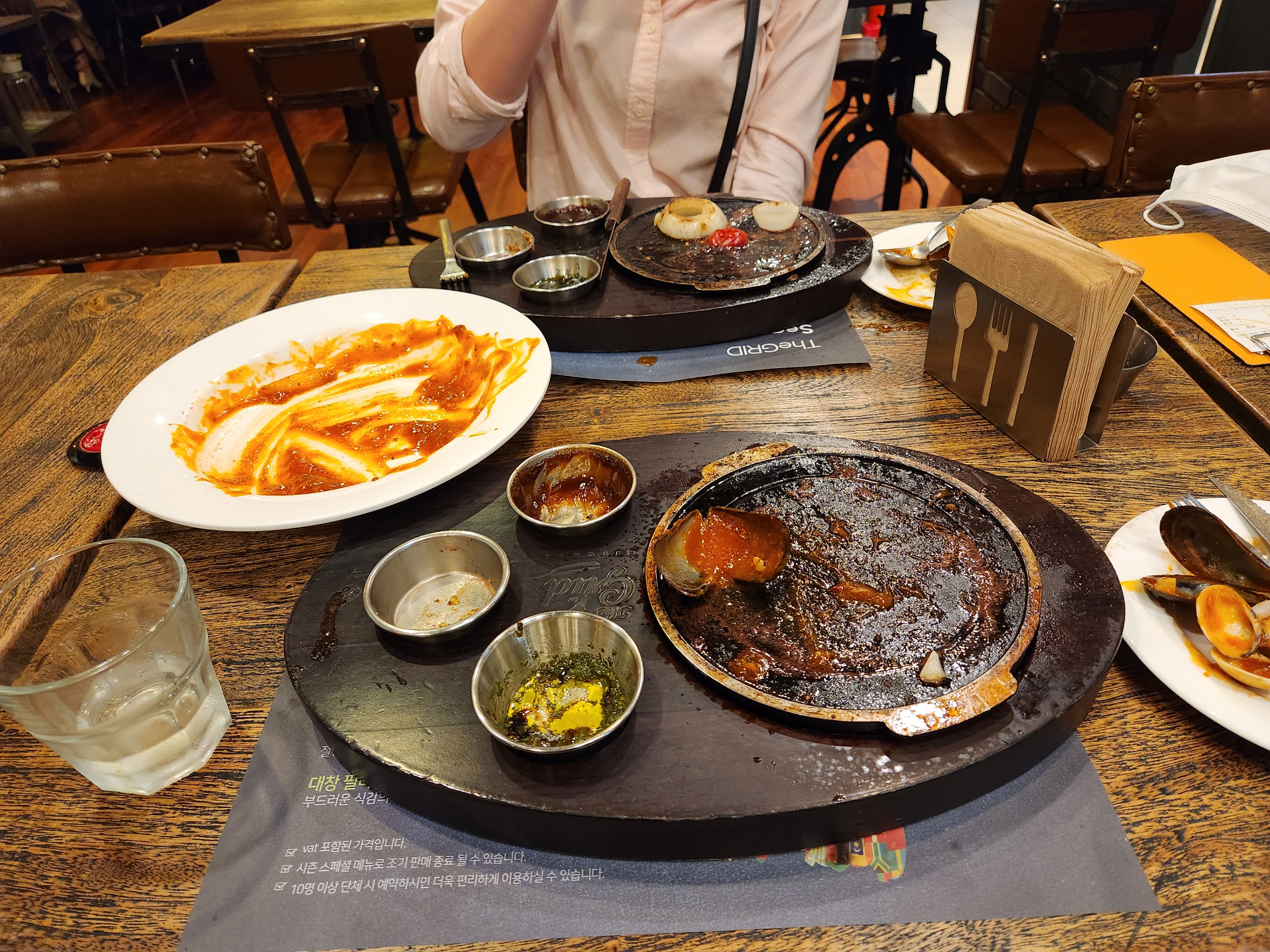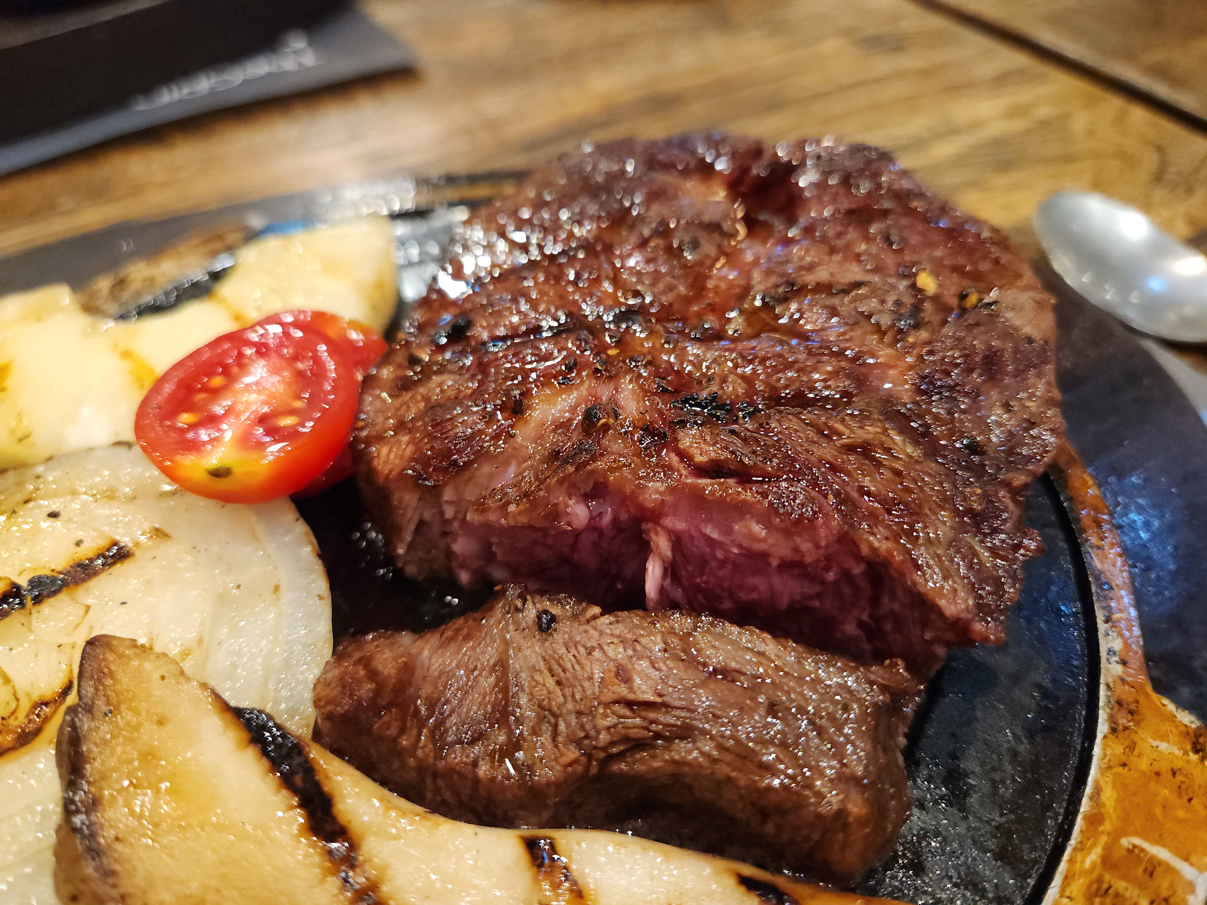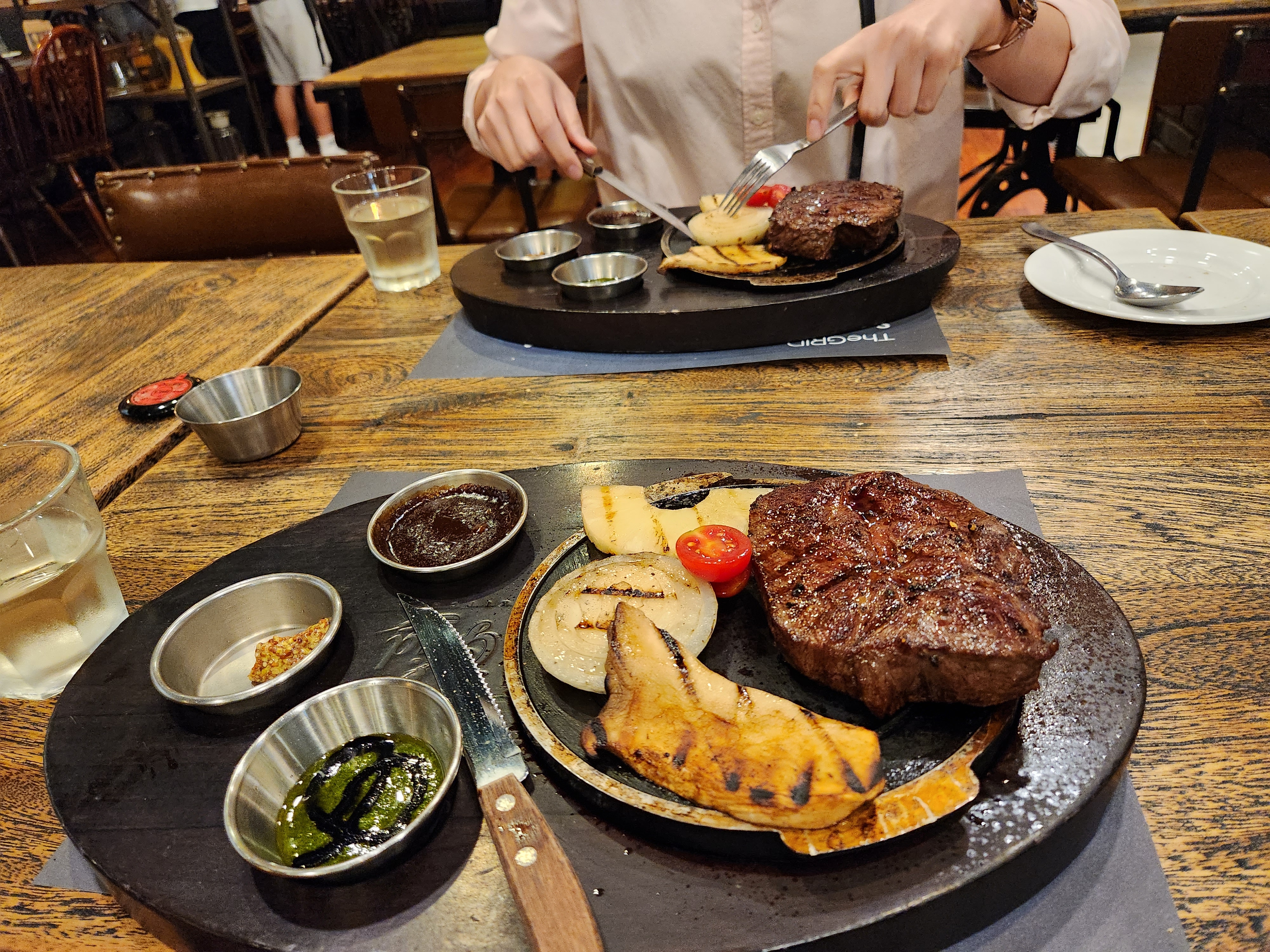 5. 스테이크의 정식 명칭은 비프 플레이트임. 왜 플레이트인지는 사진을 보면 됨. 소스 3개와 엄청 뜨거운 돌 ㅎㅎ 각종 야채에 약간 레어한 부채살 스테이크가 나옴.