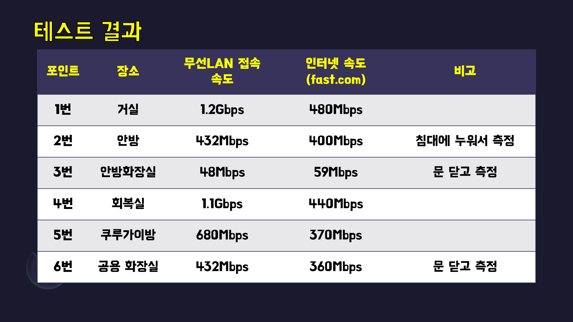 테스트 결과 AP가 설치된 거실이 가장 빠르게 측정되었습니다. AP 본체 정방향에 있는 회복실, 쿠루가이방, 공용 화장실은 대체로 좋은 속도를 뽑아주었습니다. 안방도 꽤 빠르게 나왔는데요. 문제는 3번 안방화장실이였습니다. 와이파이신호가 꺽이고 꺽여서 들어오는 좀 복잡 경로를 가진 곳인데 역시나 속도가 처참합니다. 그래도 넷플릭스 감상, 웹서핑은 못할 정도는 아니였습니다. 화장실을 위해서 MESH 구성을 해야되나 싶지만 화장실에서 어떤 대단한 일을 하는것은 아니기 때문에 참아봅니다.