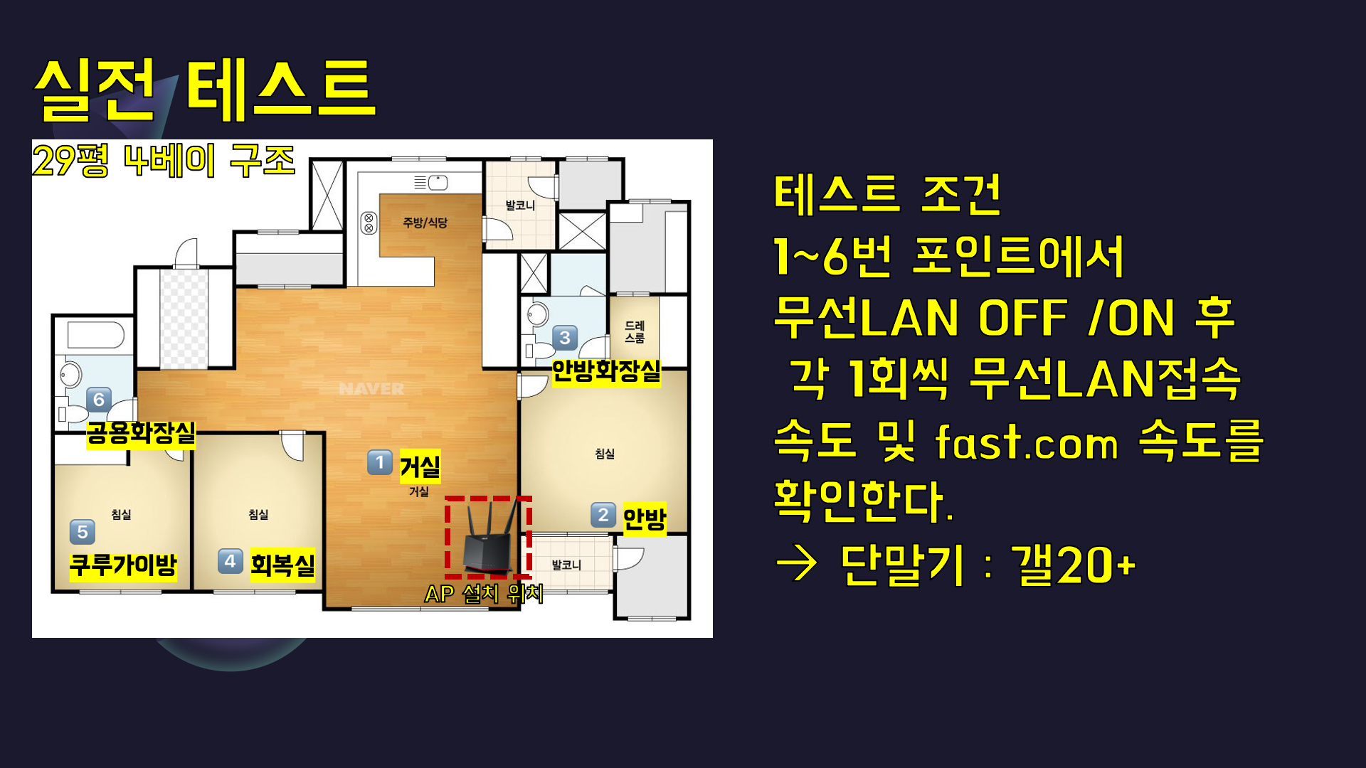 이제 진짜 빠른지 실전 테스트를 해보겠습니다. 우리집은 29평 4베이 구조를 가지고 있습니다. 주로 인터넷을 많이 사용하는 포인트 6곳을 선정했습니다. 테스트 조건은 갤럭시 20+를 포인트로 이동해서 무선LAN을 OFF/ON한 후 접속 무선LAN접속속도와 인터넷 속도를 측정합니다.