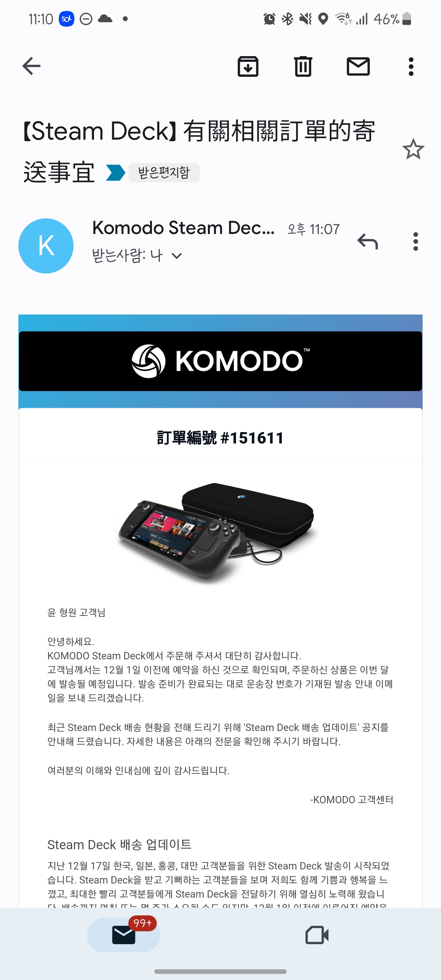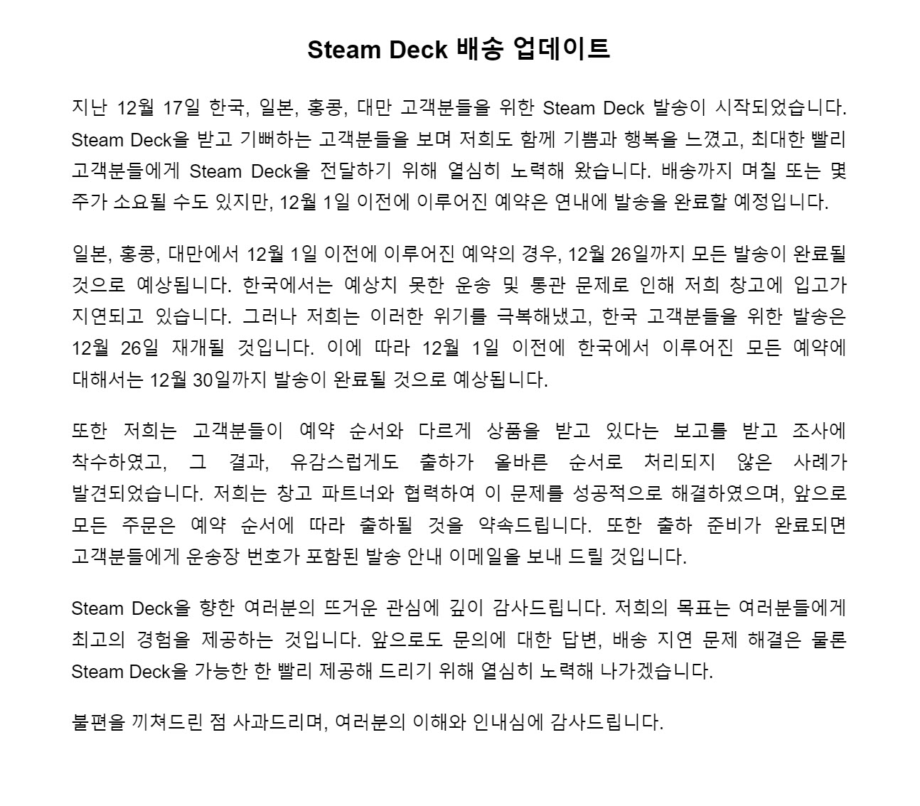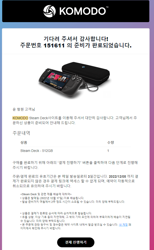 12월 초부터 순차적으로 예약했던 사람들에게 결제하라고 메일이 왔습니다. 4개월동안 오래 기다렸고 12/17 정식 발매니까 결제하라고요. 3일안에 결제 하지 않으면 예약은 자동 취소 된다는 협박성 이야기도 함께 왔습니다. 4개월동안 스팀덱에 대한 흥미가 떨어져서 이걸 구매해 말어 고민을 많이 했습니다. 디씨인사이드 스팀덱 갤러리에 들어가서 어떤점이 좋은지 이걸로 뭘 할 수 있는지 제 자신에게 암시를 걸었습니다. 그랬더니 없어졌던 뽐뿌가 다시 생기더라고요.