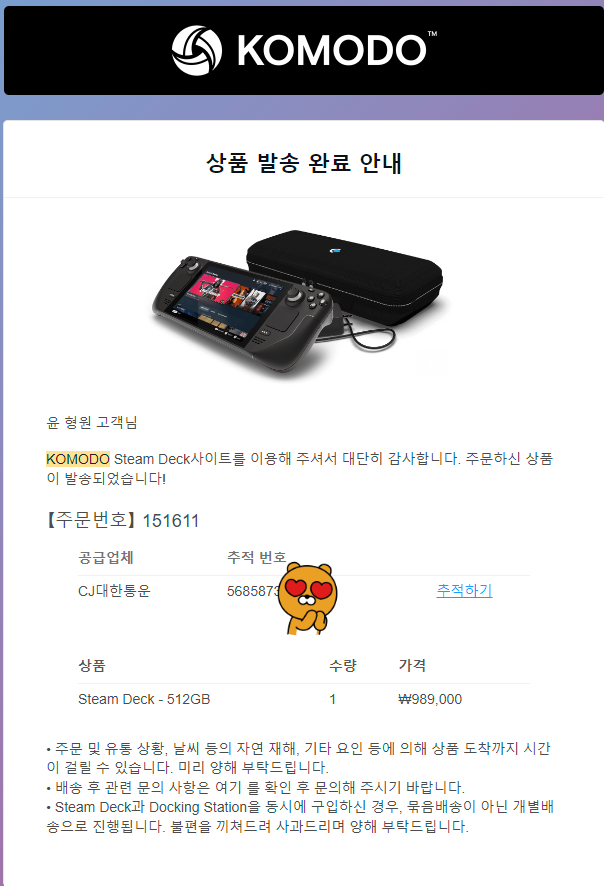 다음날 15시 정도에 배송이 완료 되어서 내 손안에 스팀덱이 들어왔습니다. 물론 같이 주문한 독도 같이 왔어요. 오자마자 바로 뜯었는데 엄청 차갑더라고요. 영하10도 추위에서 얼마나 고생이 많았니..스팀덱아..ㅠㅠ