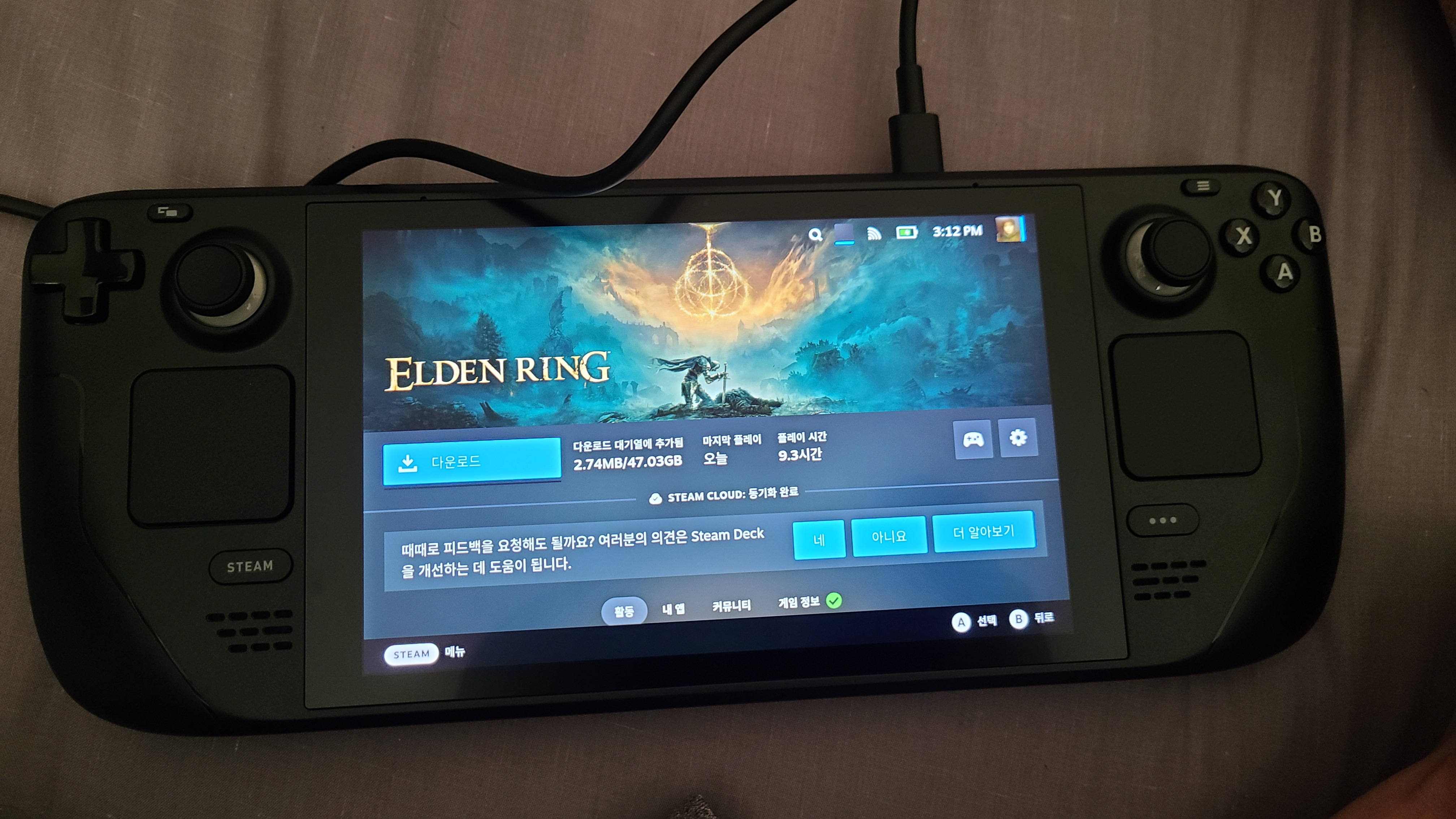 그리고 동작 테스트를 해보았는데. 첫게임 설치는 바로 '엘던 링'으로 정했습니다. 엘던링은 약 47GB로 용량이 좀 되는데요. 스팀덱이 WIFI5를 지원해서 그런지 초당 50MB/s 정도는 계속 무난하게 다운로드 받더라고요.(저희집은 500MBPS 입니다.) 한 10분? 15분 정도 기다리니까 다운로드가 완료되어서 바로 실행할 수 있었습니다. 엘던링은 스팀덱 완벽호환이라서 별도 세팅은 필요없이 실행이 가능합니다. 프로톤이라는 기술을 이용해서 윈도우 없이도 윈도우게임을 실행할 수 있도록 해주는게 들어가 있어서...아주 좋아요!