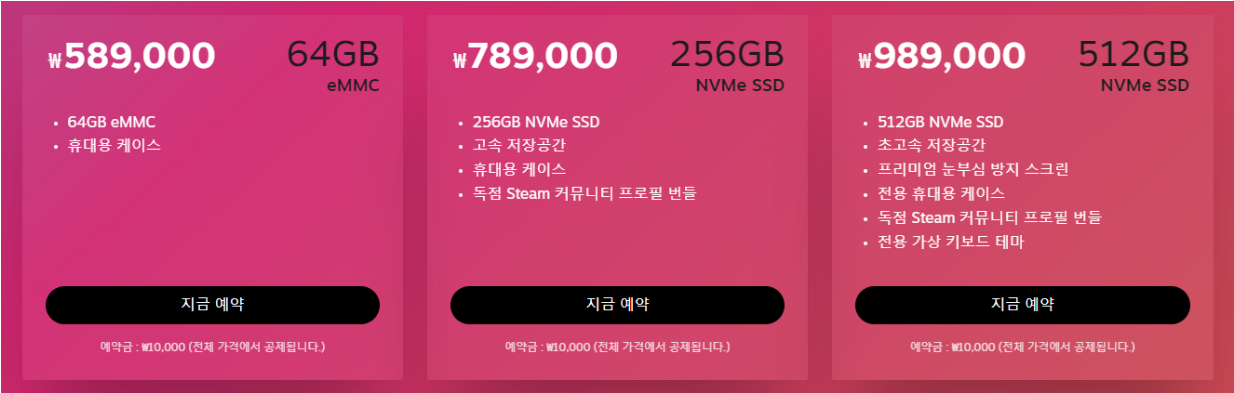 지난 8월, 코모도에서 올해말에 스팀덱을 정식 출시 예정이라고 하면서 예약주문을 받았습니다. 64/256/512GB 이렇게 선택할 수 있습니다. 64GB는 59만원 부터 시작해서 512GB는 거의 100만원에 육박하는 금액입니다. 애플에서 하던 용량 장난질을 여기서 보게 될 줄이야.ㅠㅠ