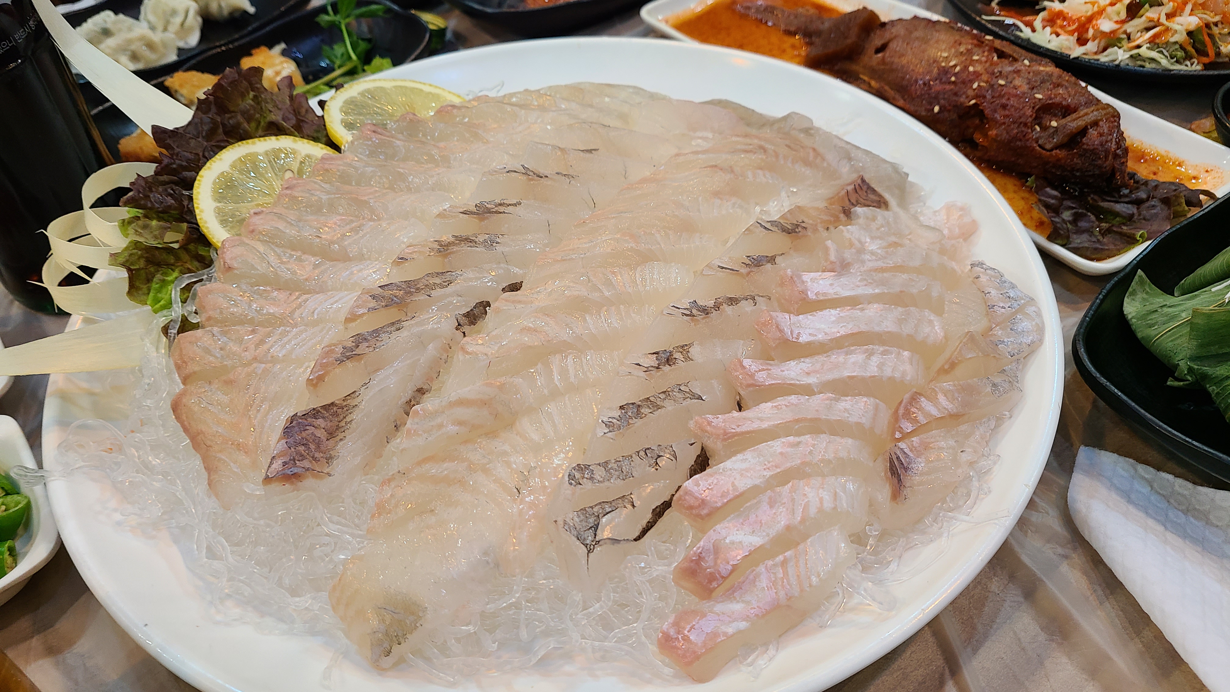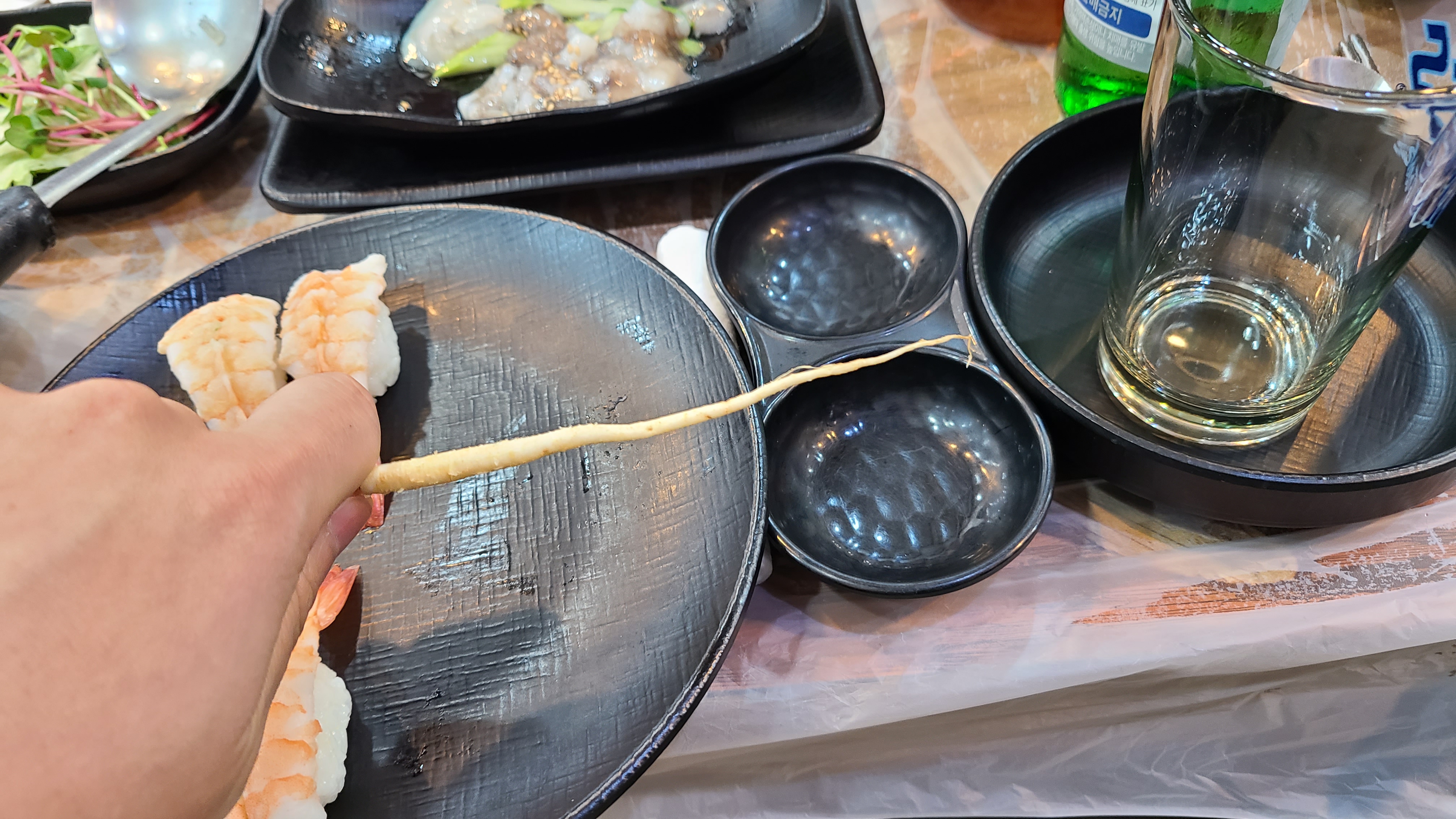 3. 광어회가 나오기 전에 장뇌삼, 열갱이, 가리비탕, 스시, 새우튀김 등 스끼다시가 아주 풍성하게 나왔습니다. 이섯만으로 벌써 배가 불렀어요. 남도 밥상이 부럽지 않았습니다.